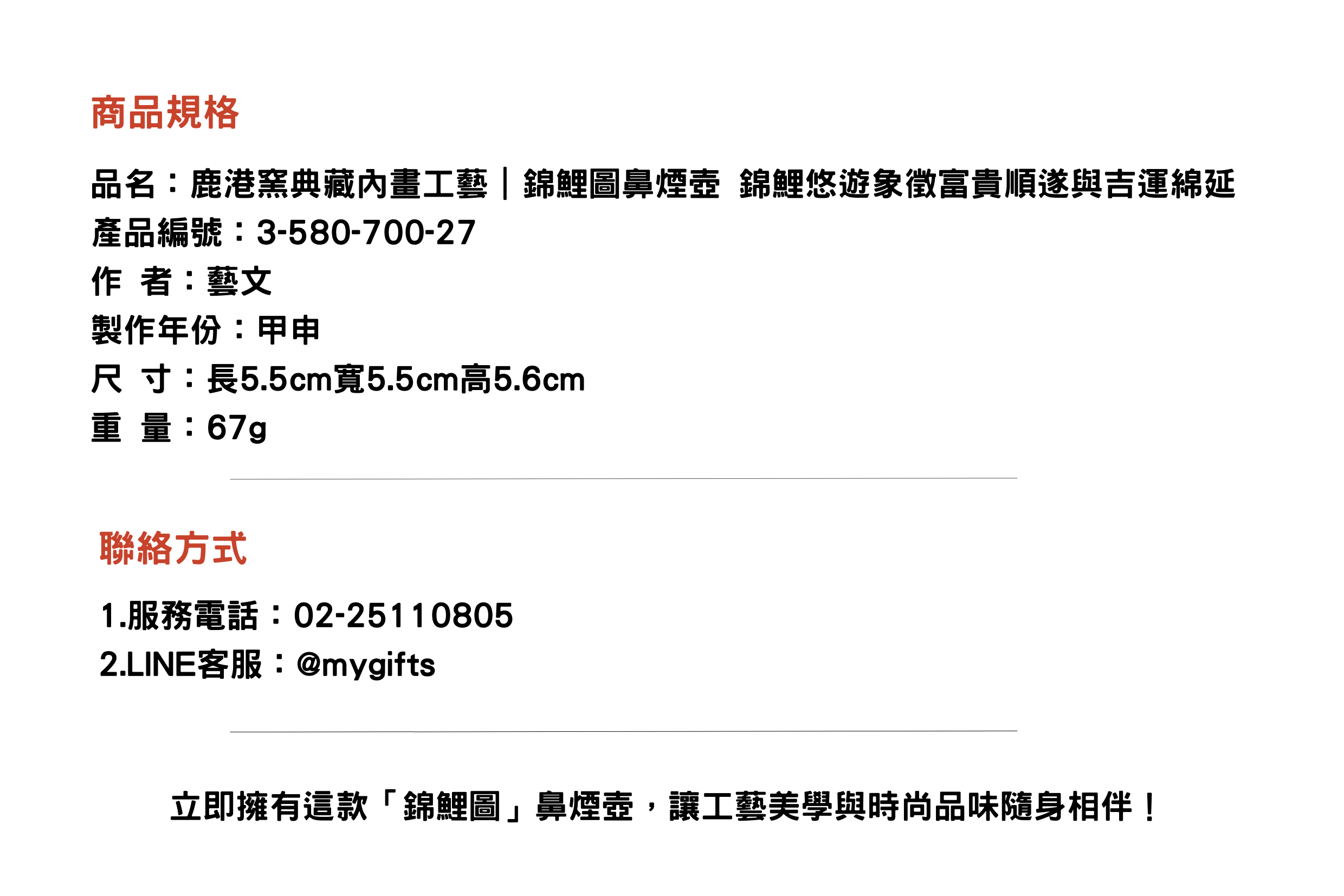 鹿港窯典藏級錦鯉圖鼻煙壺,展現精工內畫與薄胎水晶工藝,將錦鯉悠游姿態細膩描繪,象徵富貴、吉祥與順遂。魚缸壺形搭配瑪瑙蓋,古雅別緻,兼具藝術價值與祝福寓意,收藏贈禮皆宜。
