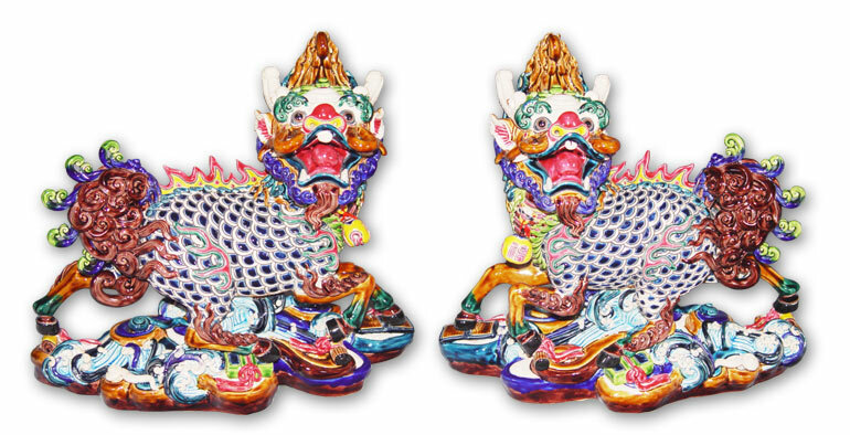 手工交趾陶四寶麒麟對,象徵仁者平步青雲,林智信彩繪製作,具文化與祝福意涵,收藏或送禮皆宜。