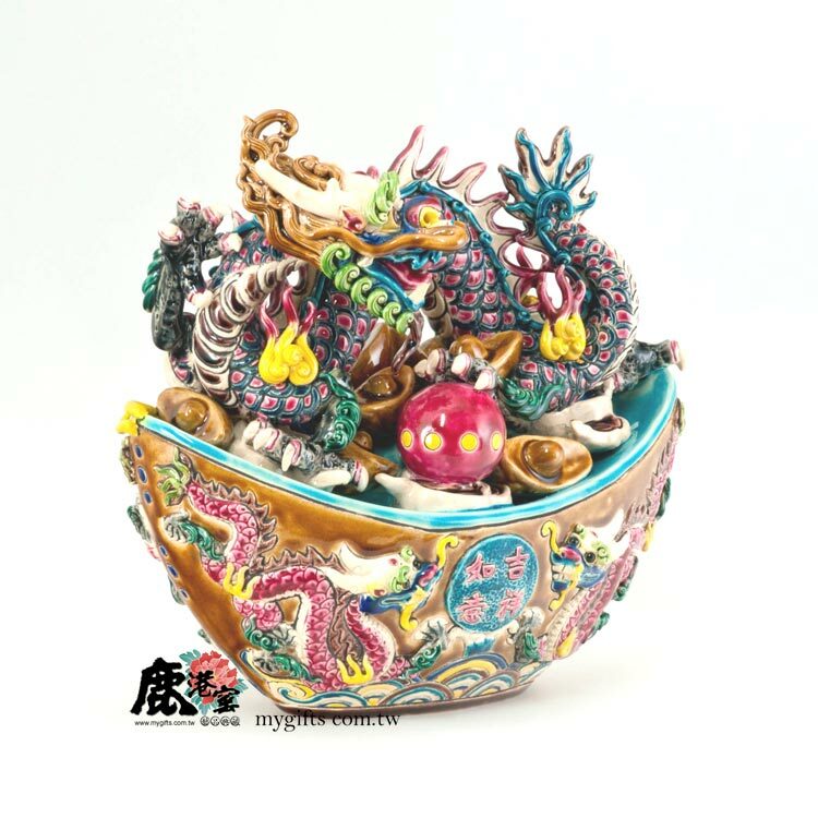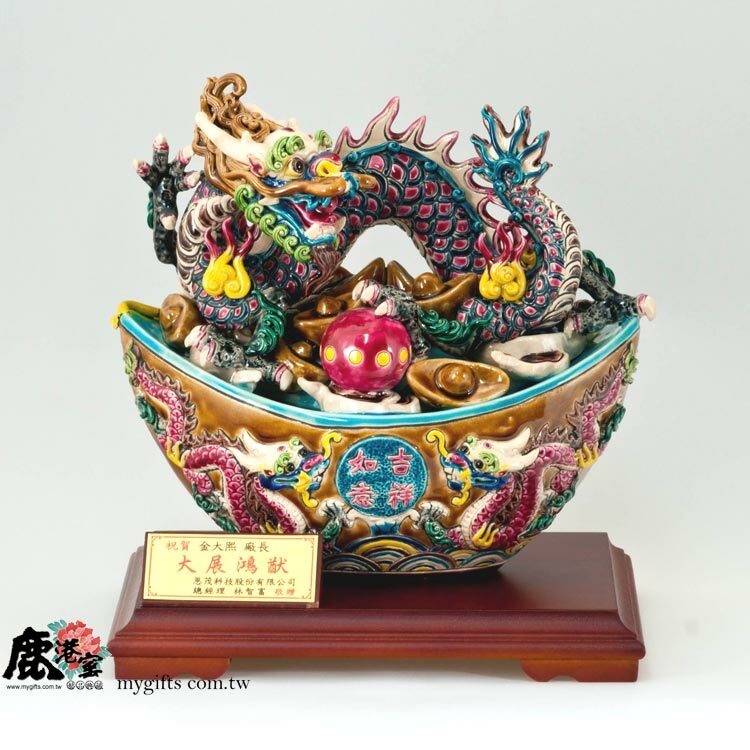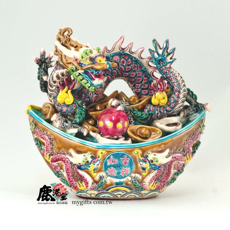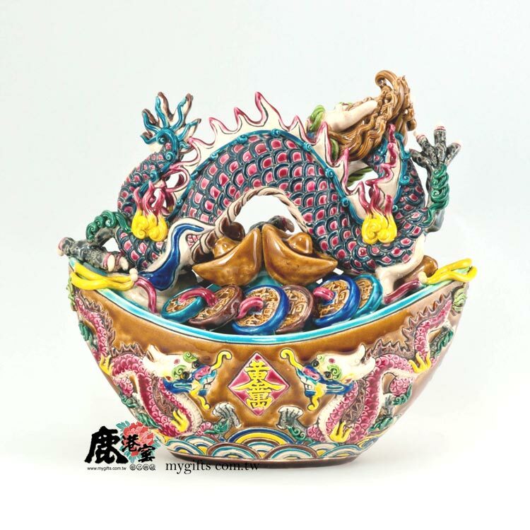 以龍為主題的交趾陶擺飾,象徵招財進寶與雲雨萬象,手工打造、彩繪細緻,具高收藏與贈禮價值。