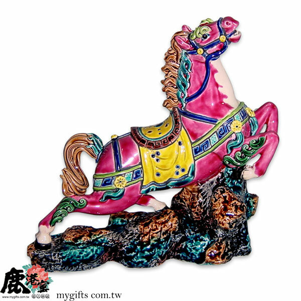 交趾陶紅寶馬,以手工捏製與彩繪呈現「馬到成功」之意,象徵順利得勝、吉運臨門,典雅實用的台灣特色禮品。