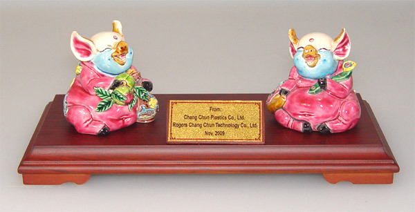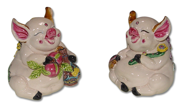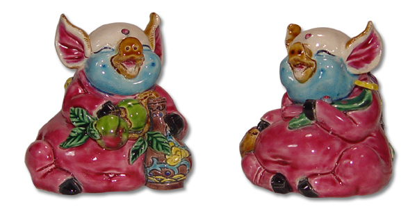交趾陶諸事平安如意系列,兩隻吉祥豬捧花瓶與壽桃,象徵平安長壽。手工彩繪工藝,傳遞祝福心意,收藏送禮皆宜。