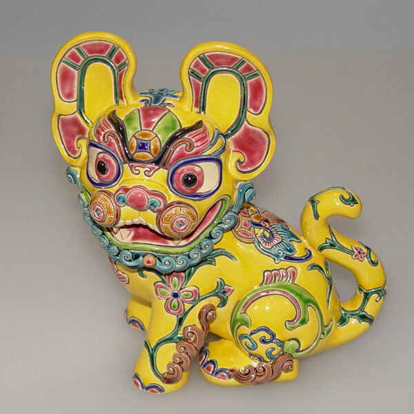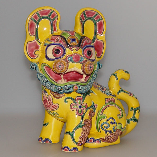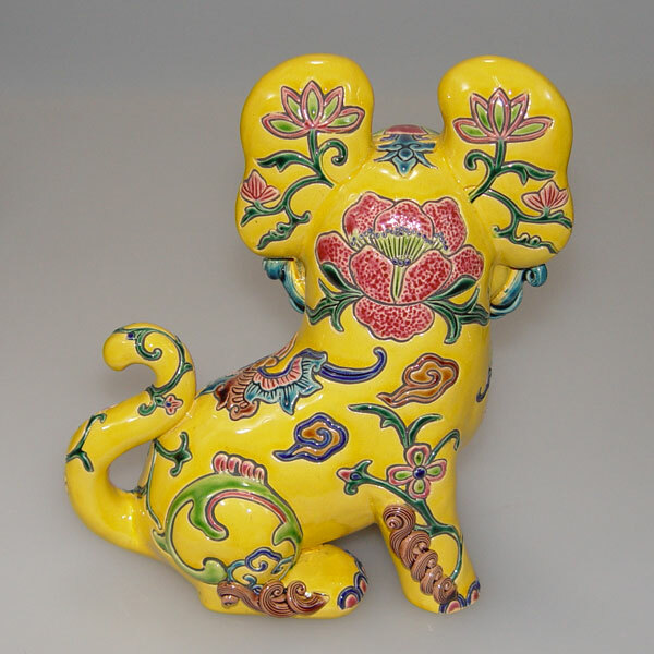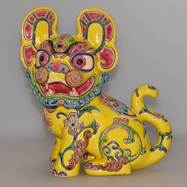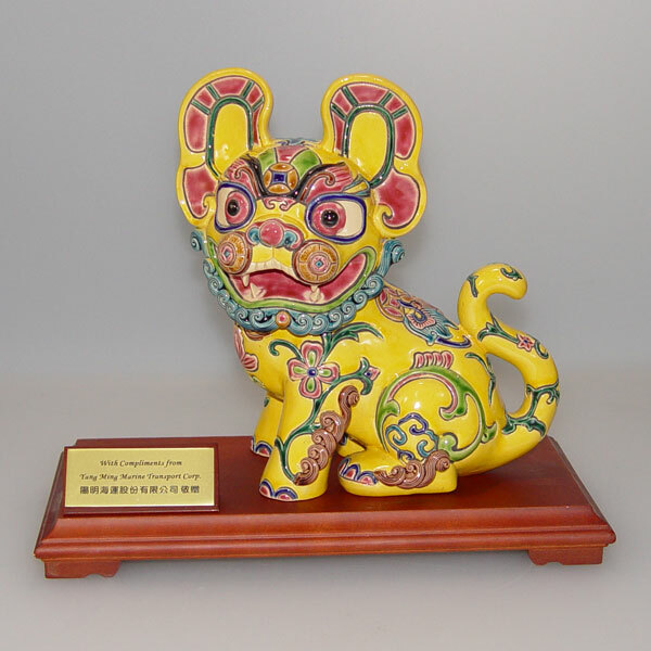交趾陶福虎招財,手工彩繪呈現富貴寓意,虎諧音「福」,結合古錢與蝙蝠象徵財運與好運,商務送禮首選。