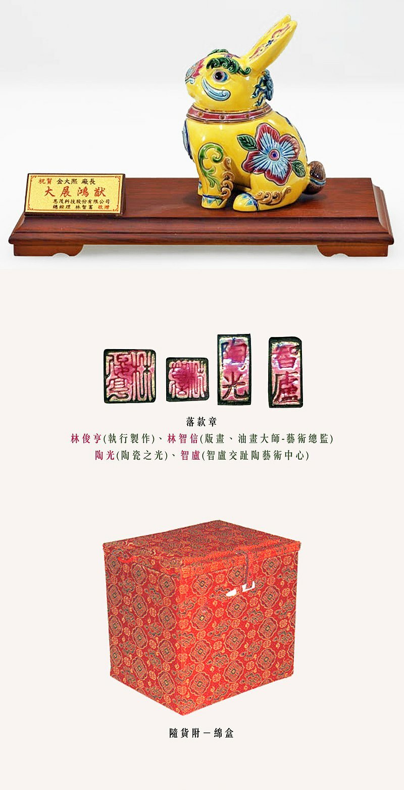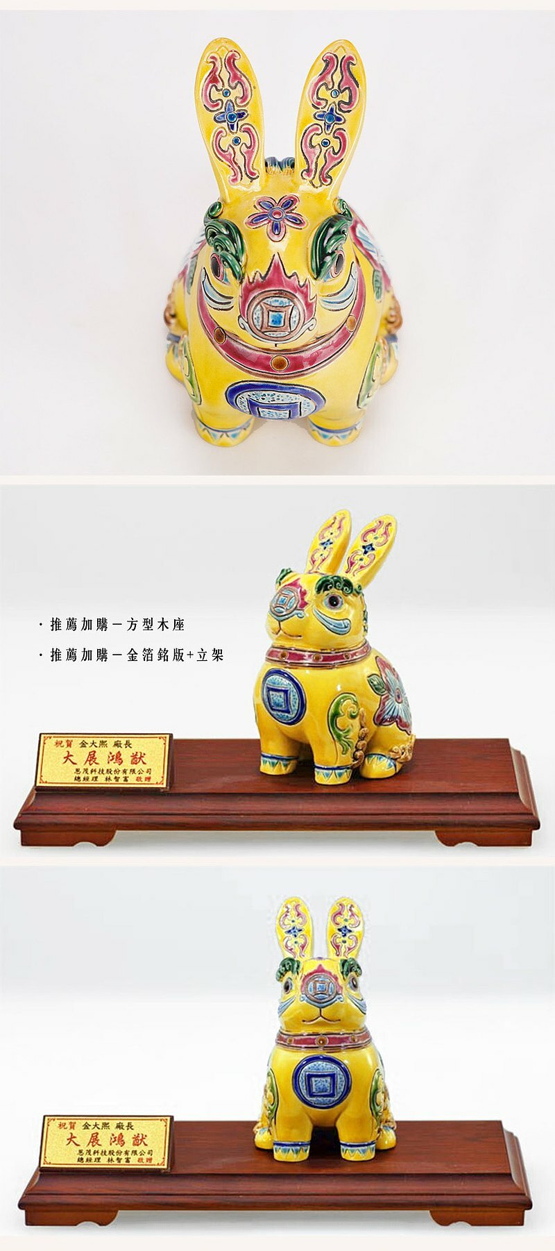 以台灣傳統工藝製成,象徵多產、子孫繁榮與百財納福。兔子活潑跳躍的姿態,寓意精神飽滿、好運連連。兔愛吃蘿蔔與白菜,蘊含「彩頭」與「百財」的吉祥意涵。適合春節送禮、尾牙獎品、企業伴手禮或節慶交換禮物,是一款極具台灣文化特色與開運象徵的吉祥擺飾。