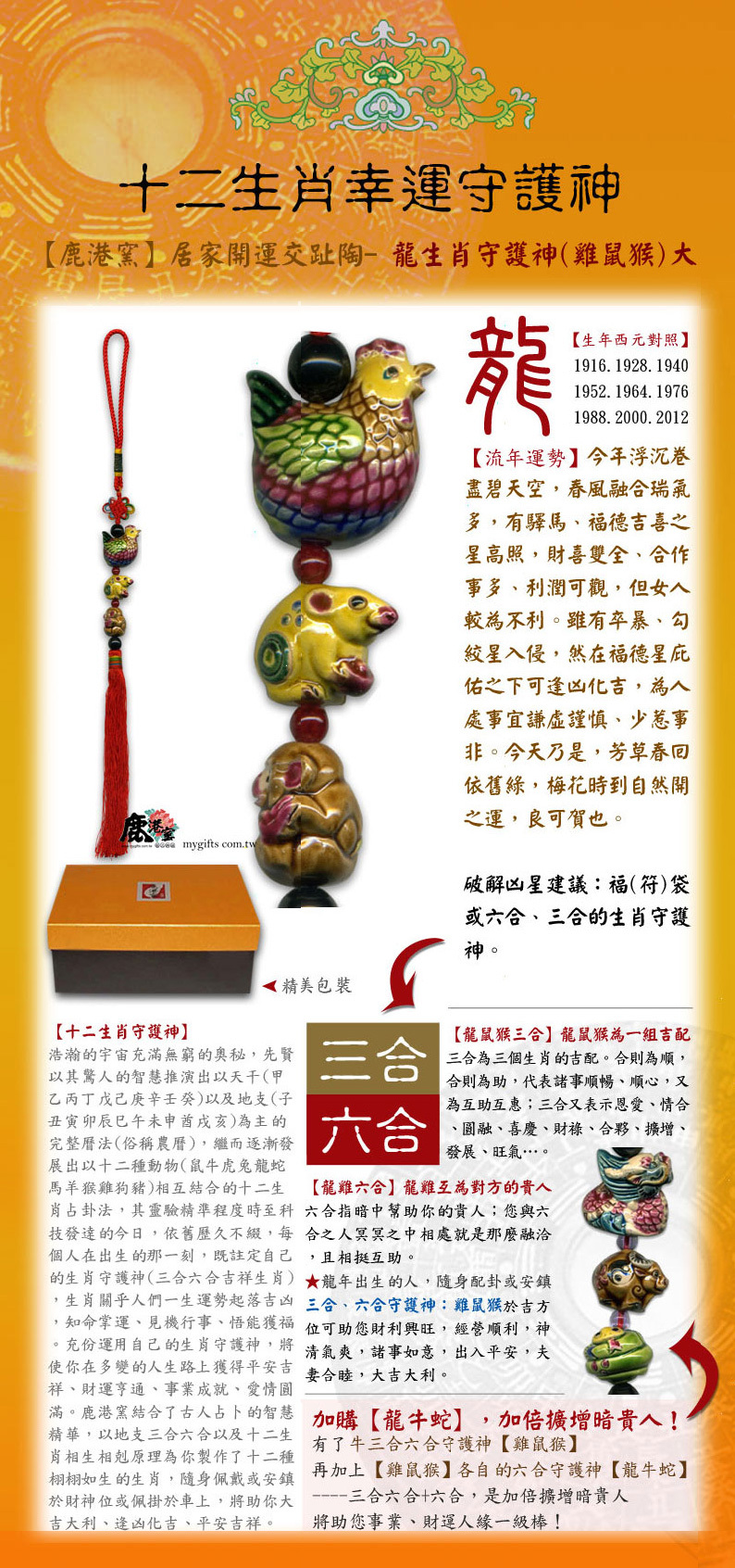 生肖龍專屬守護神吊飾,結合雞、鼠、猴三合六合,助運開財、招福納吉,適合隨身配戴或居家佈置。