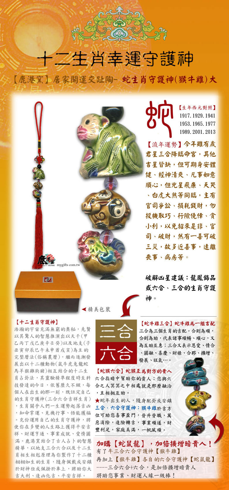 生肖蛇專屬守護吊飾,融合猴牛雞三合六合吉祥物,化煞招福、事業順利,是居家與隨身的風水好物。