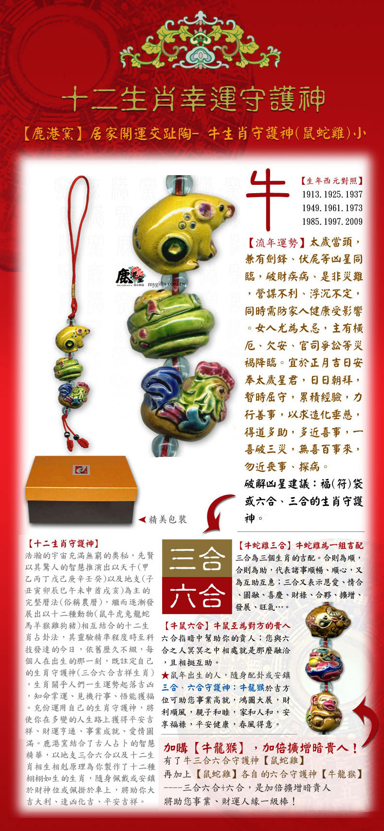 生肖牛三合守護神吊飾,融合鼠、蛇、雞之吉運能量,小巧交趾陶工藝設計,化煞招財、諸事如意,平安幸福隨身守護。