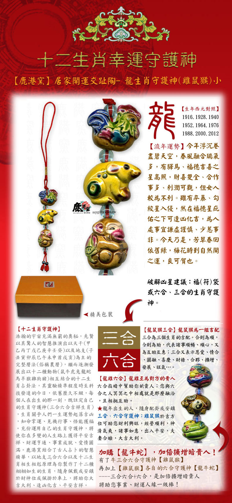 生肖龍吊飾守護雞、鼠、猴,傳統三合六合開運設計,交趾陶手工打造結合中國結設計,隨身吉祥好物。