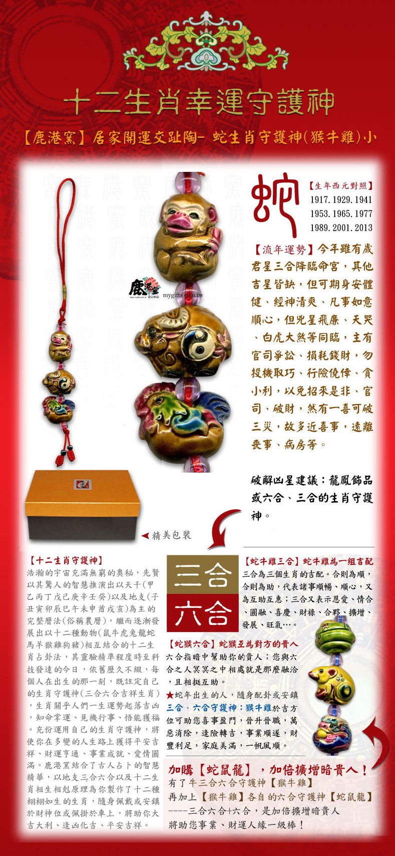 生肖蛇吊飾守護猴、牛、雞,三合六合加持,手工交趾陶+中國結設計,易攜帶開運吉祥飾品。