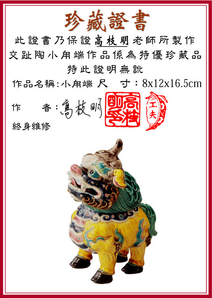 在臺灣傳統工藝中,交趾陶因其色彩絢麗與文化寓意深遠而備受喜愛。而這款《台灣國寶交趾陶|小甪端香爐》更融合藝術與風水吉祥的雙重意涵。由工藝名家高枝明老師親手打造,以傳說神獸甪端為造型,牠與麒麟同列祥瑞之獸,頭生一角,日行萬里,能辨是非、通四方語,象徵正義與通達。香爐設計既具觀賞性,也能實際使用,適合點香淨室、淨心,帶來安定與福氣。放置於家中、書房或佛堂,不僅提升空間氣質,也為生活增添一份祥瑞與靜謐。是一件具收藏、實用與祈福三重價值的藝術好物。