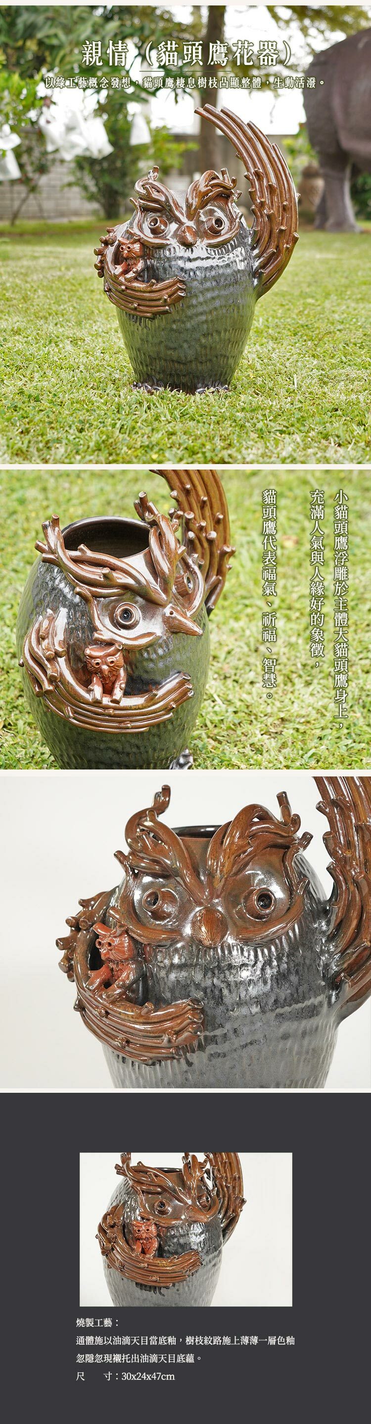 以綠工藝概念發想,貓頭鷹棲息樹枝凸顯整體,生動活潑。 小貓頭鷹浮雕於主體大貓頭鷹身上,充滿人氣與人緣好的象徵,貓頭鷹代表福氣、祈福、智慧。 燒製工藝: 通體施以油滴天目當底釉,樹枝紋路施上薄薄一層色釉,忽隱忽現襯托出油滴天目底蘊。