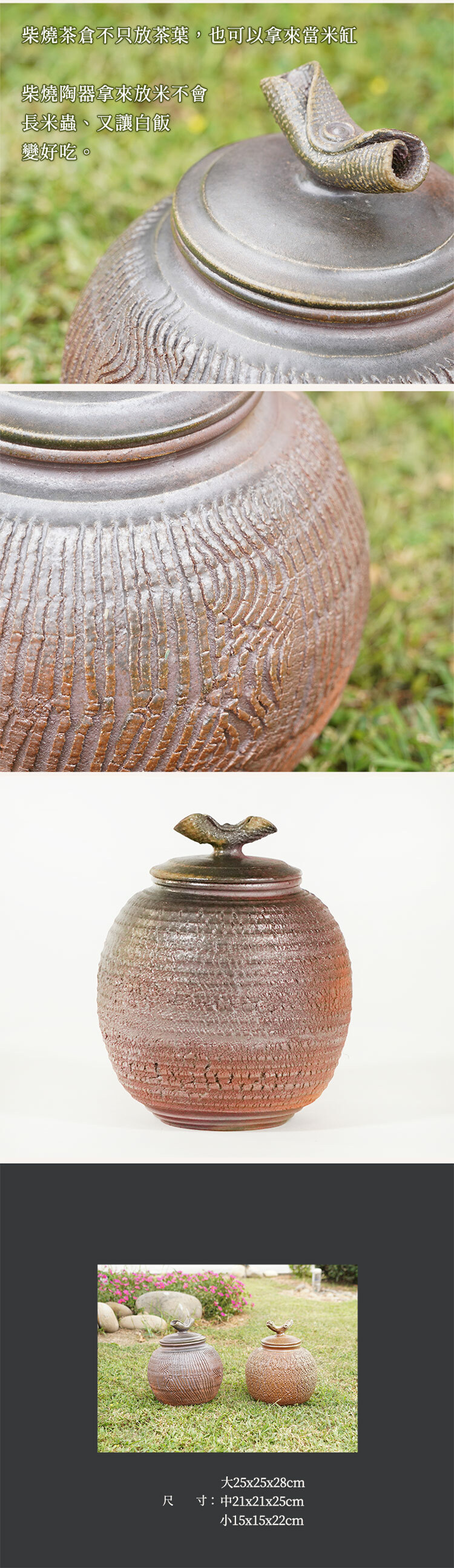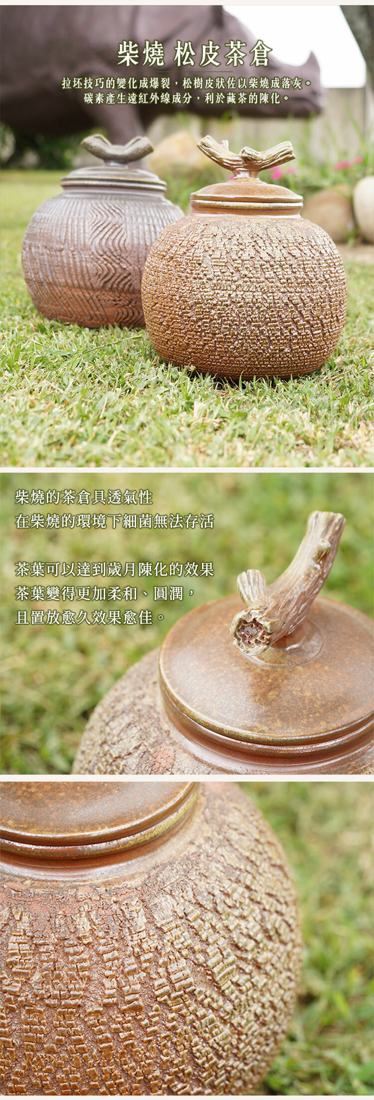 拉坯技巧的變化成爆裂,松樹皮狀佐以柴燒成落灰。碳素產生達紅外線成分,利於藏茶的陳化。 柴燒的茶倉具透氣性,在柴燒的環境下細菌無法存活,茶葉可以達到歲月陳化的效果,茶葉變得更加柔和、圓潤,且置放愈久效果愈佳