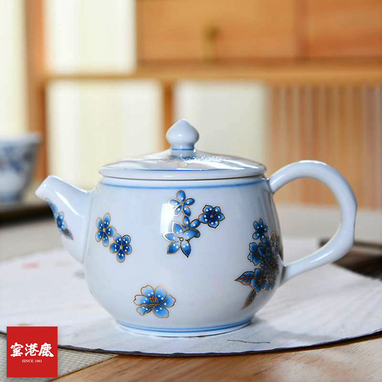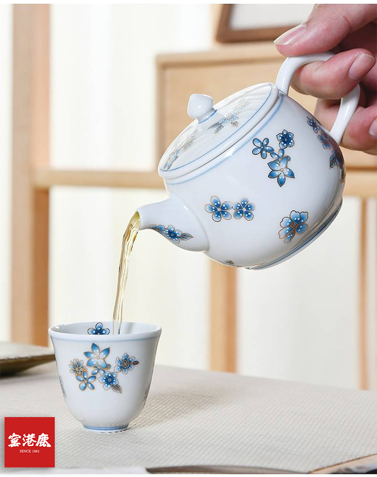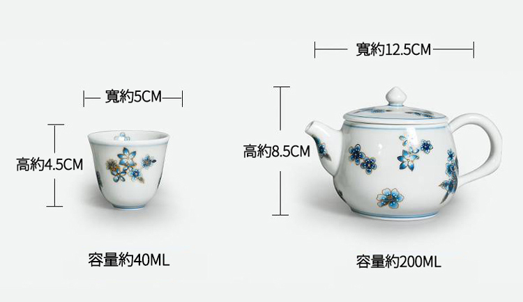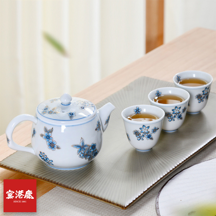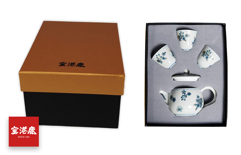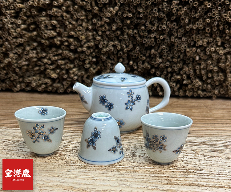 手繪金絲藍花幸福茶組4入禮盒套裝(1壺3杯)│好茶器值得擁有