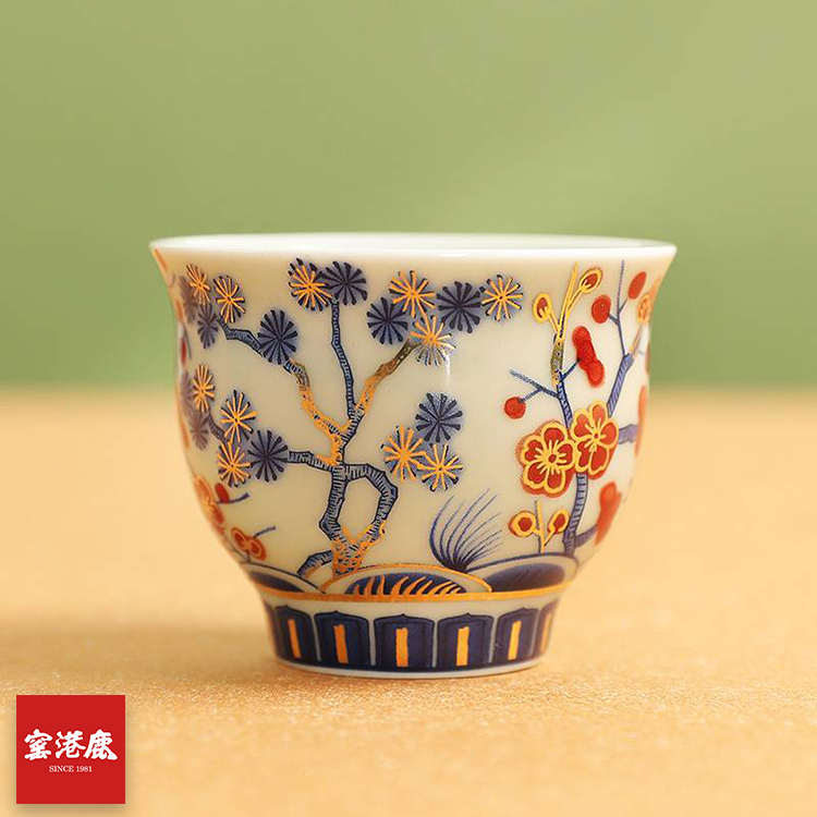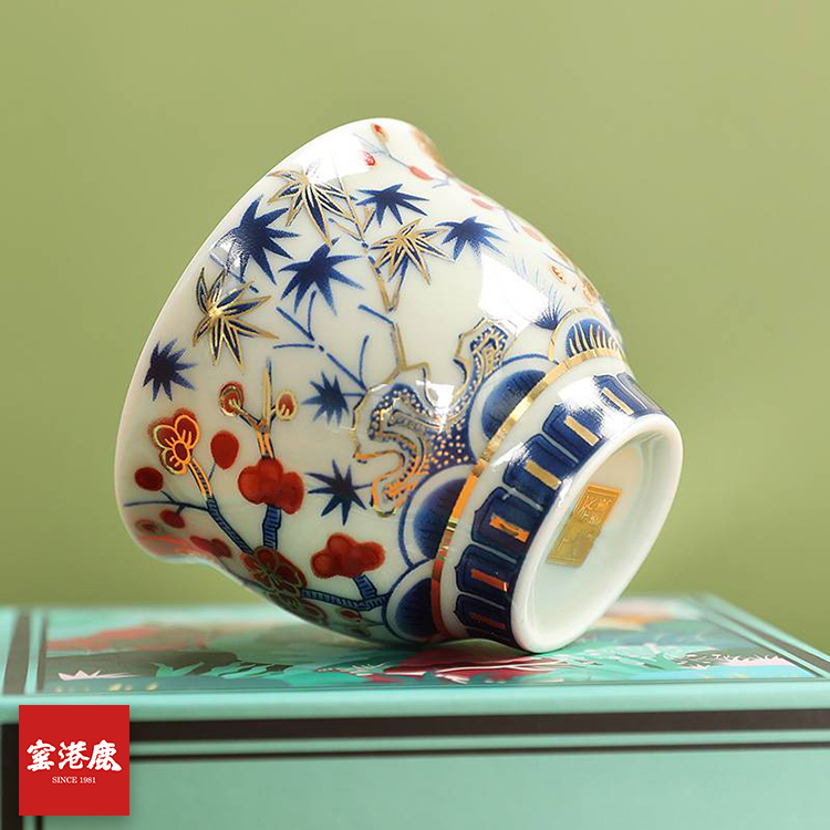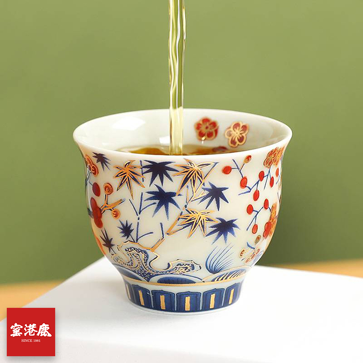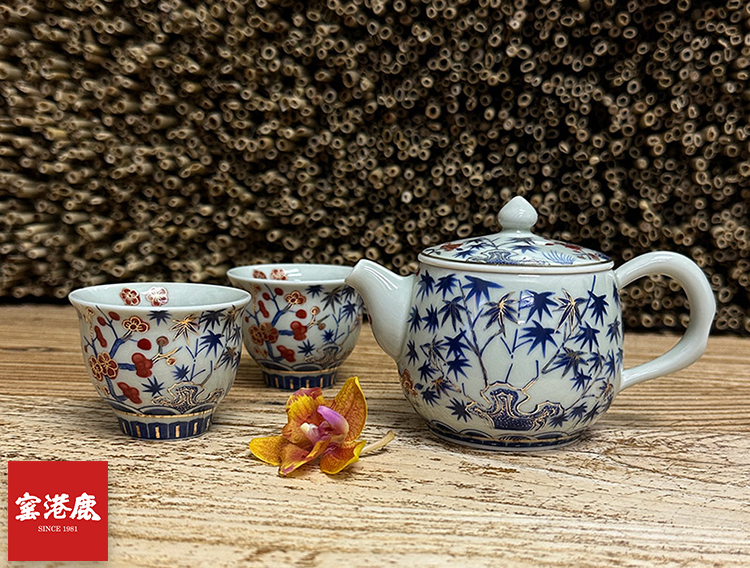 茶具組以手繪描金技法呈現四季花卉,壺身與杯面紋理細膩,金色點綴如陽光灑落,流露古典雅韻。茶壺造型圓潤,壺把線條優美,握持間感受溫潤手感,猶如捧著歲月的溫柔。兩只茶杯相伴,花鳥栩如生,彷彿將四季美景凝聚於掌心。品茗時,茶香隨金色光影流轉,心境悠然,盡享生活的富貴與祥和。