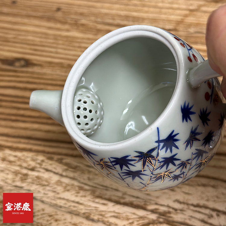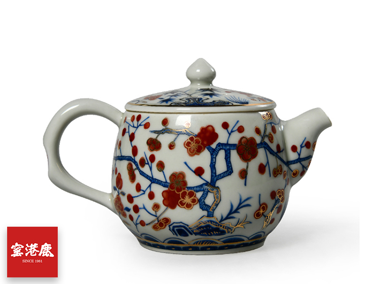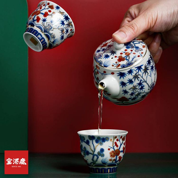 手繪描金四季發財茶具組,古典紋理,創意造型,壺把古韻,質感溫和,送禮品茗首選。