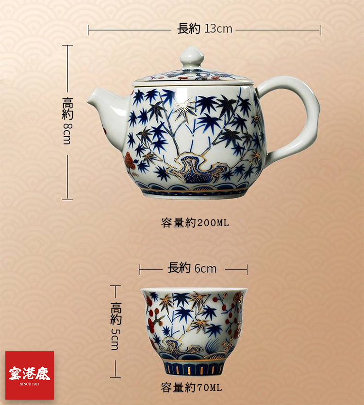 尺寸:茶壺直徑;12.5cm高8.5cm;口徑;5.8cm 茶杯高;5cm 杯子口徑;6cm