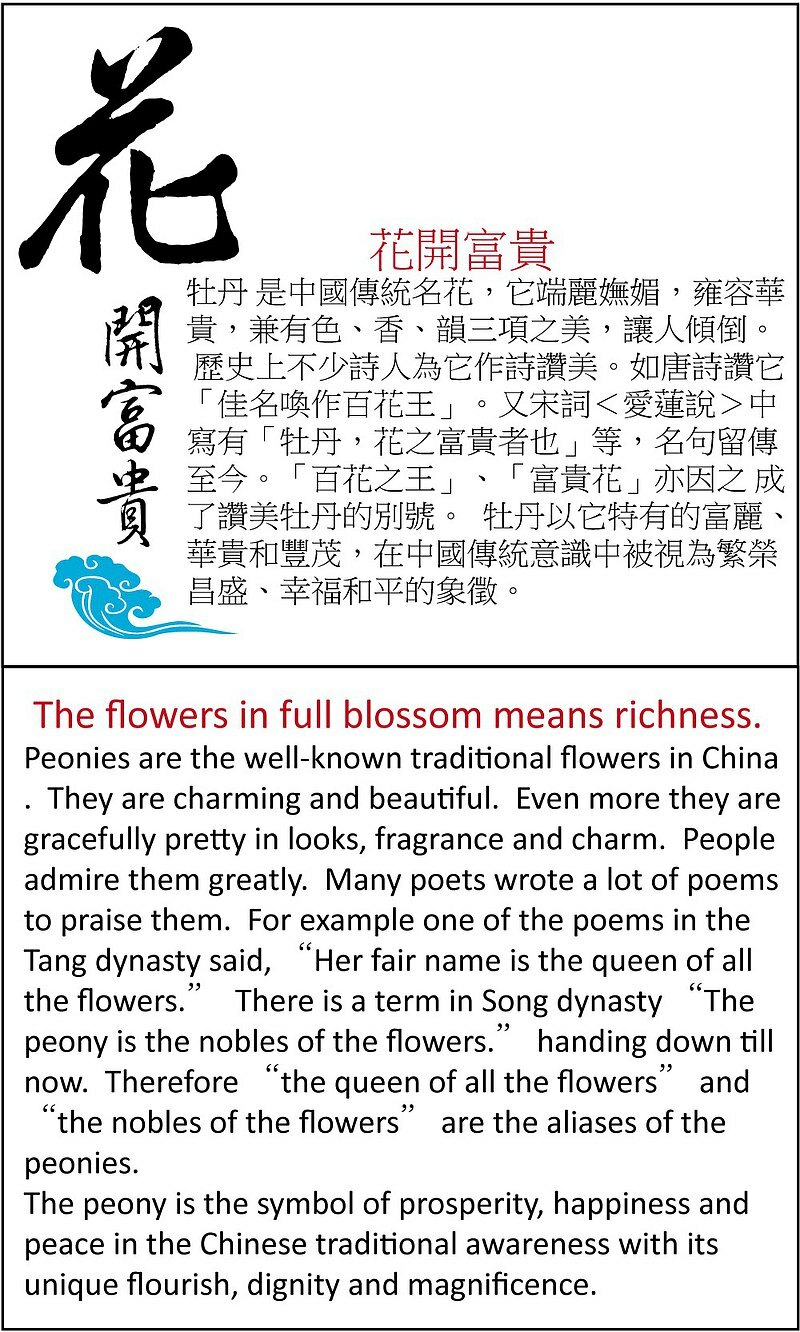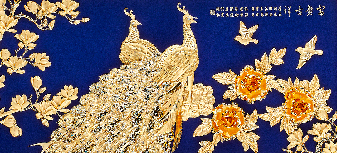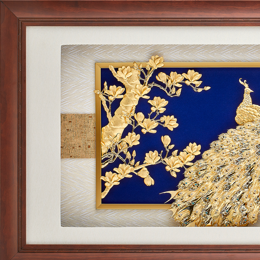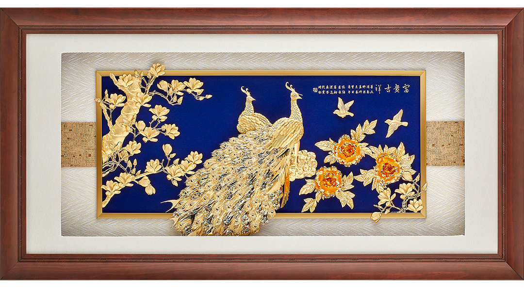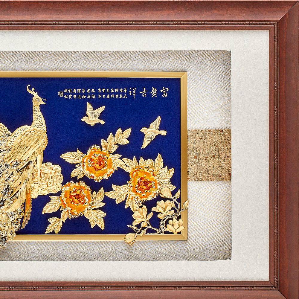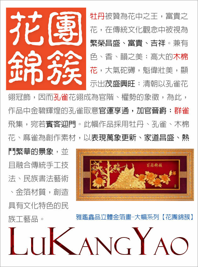 孔雀的羽翼高貴祥瑞,牡丹花開富貴,玉蘭花高潔富貴,吉祥,錦榮 加官晉爵,繁榮昌盛,前程似錦。 作品以誇張的孔雀羽毛層層疊疊,金碧輝煌,多采多姿,象徵著富貴吉祥!純手工製作而成,再加上採用高級藝術框裱褙;而成一幅金碧輝煌的藝術畫作!