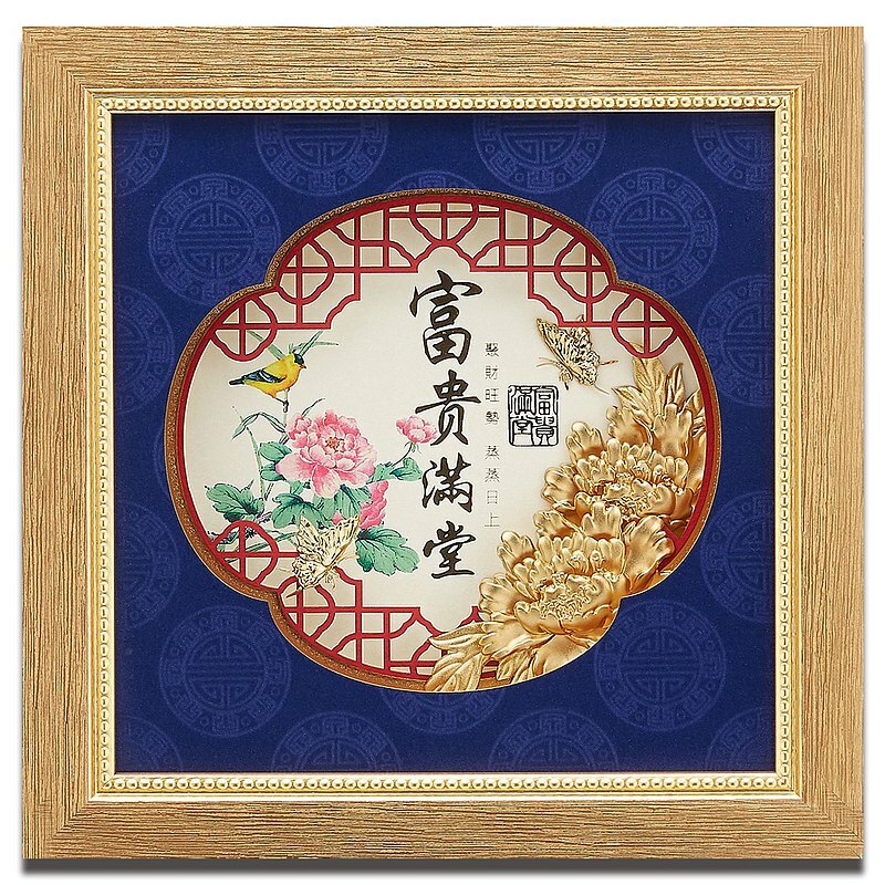 品名:雅鑑鑫品-立體金箔畫-金鴻喜系列【富貴滿堂_藍底_開窗】