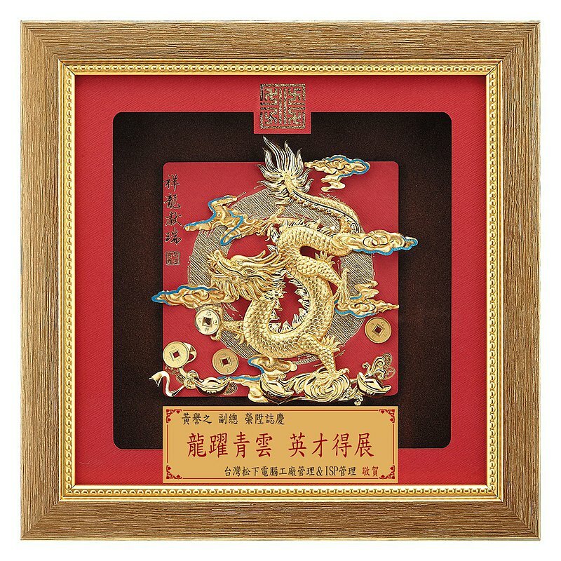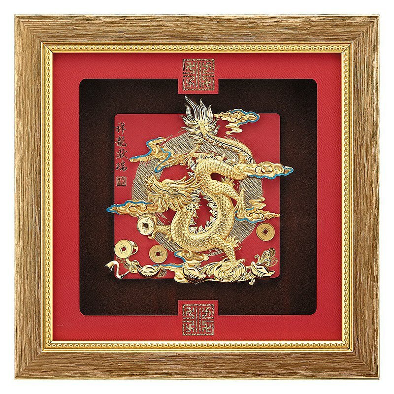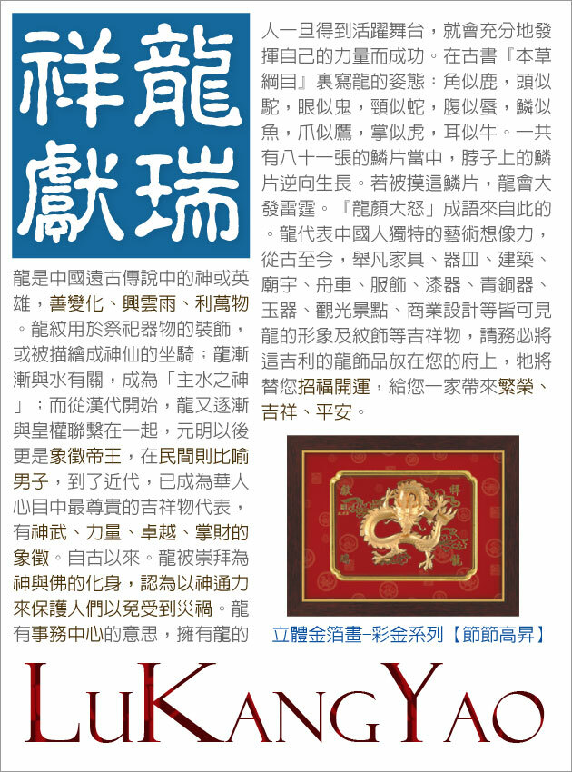 以金箔雕飾之「龍」在華夏傳統上具有神的意象,白練騰空,雙龍吐霧,因而有遇水生財、吉慶祝賀的意含。