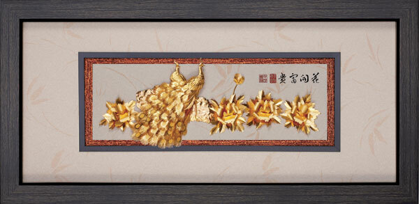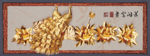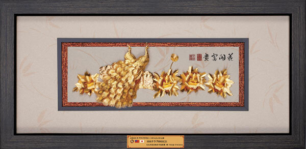 作品以誇張的孔雀羽毛層層疊疊,金碧輝煌,多采多姿,象徵著富貴吉祥!