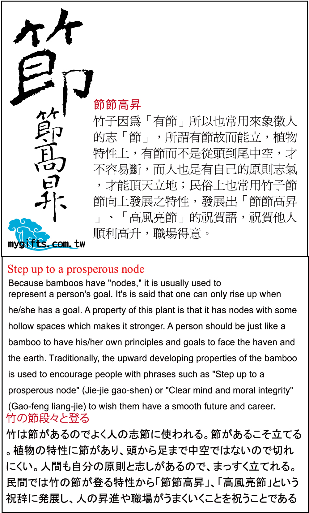 竹子因為「有節」,所以也常用來象徵人的志「節」,又因竹子節節向上發展之特性,發展出「節節高昇」的祝賀語,祝賀他人順利高升,職場得意!