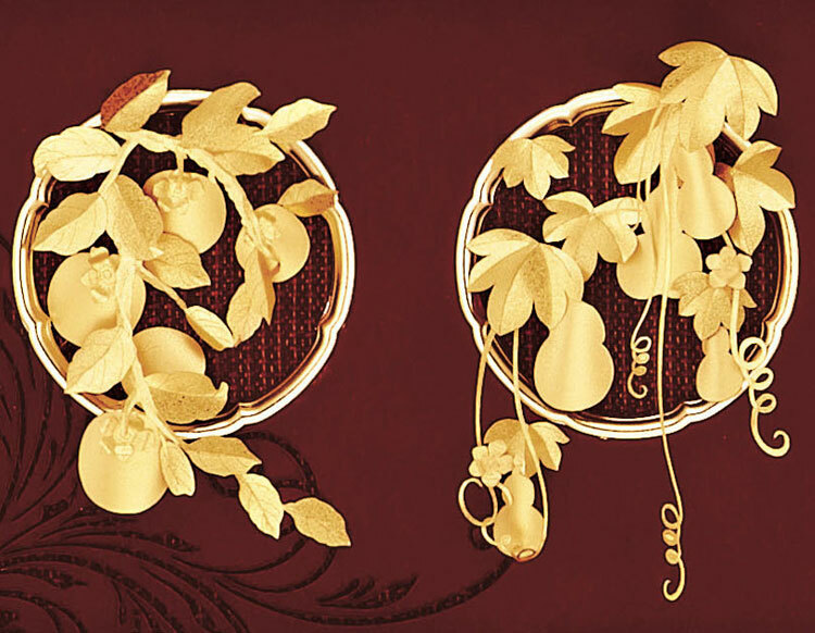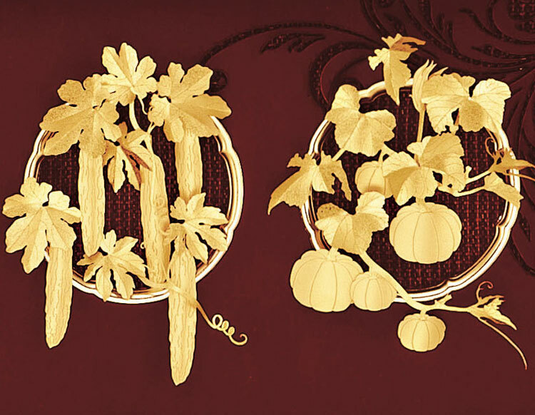 立體金箔紙雕藝術,融合葫蘆、柿子、苦瓜與南瓜意象,象徵福運綿延、事事如意。999純金箔製作,尊貴典雅,可客製題字。