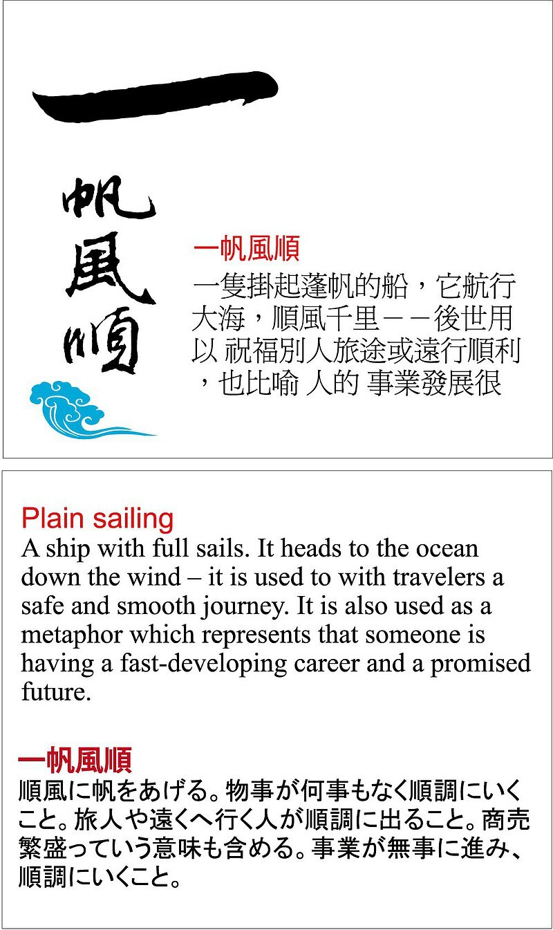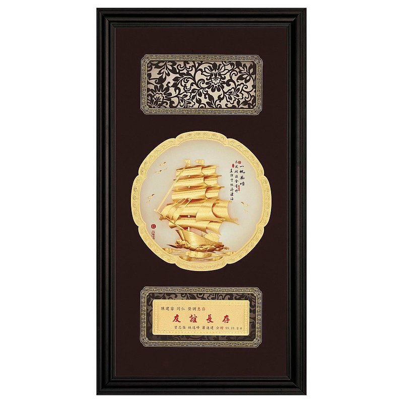 一帆風順: 一隻掛起蓬帆的船,它航行大海,順風千里--後世用以 祝福別人旅途或遠行順利 ,也比喻 人的 事業發展很快,前程一直非常順利 。 獎牌擺飾均適宜