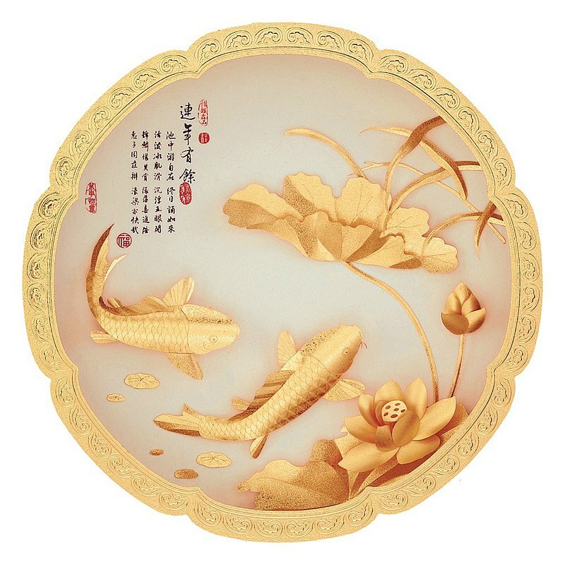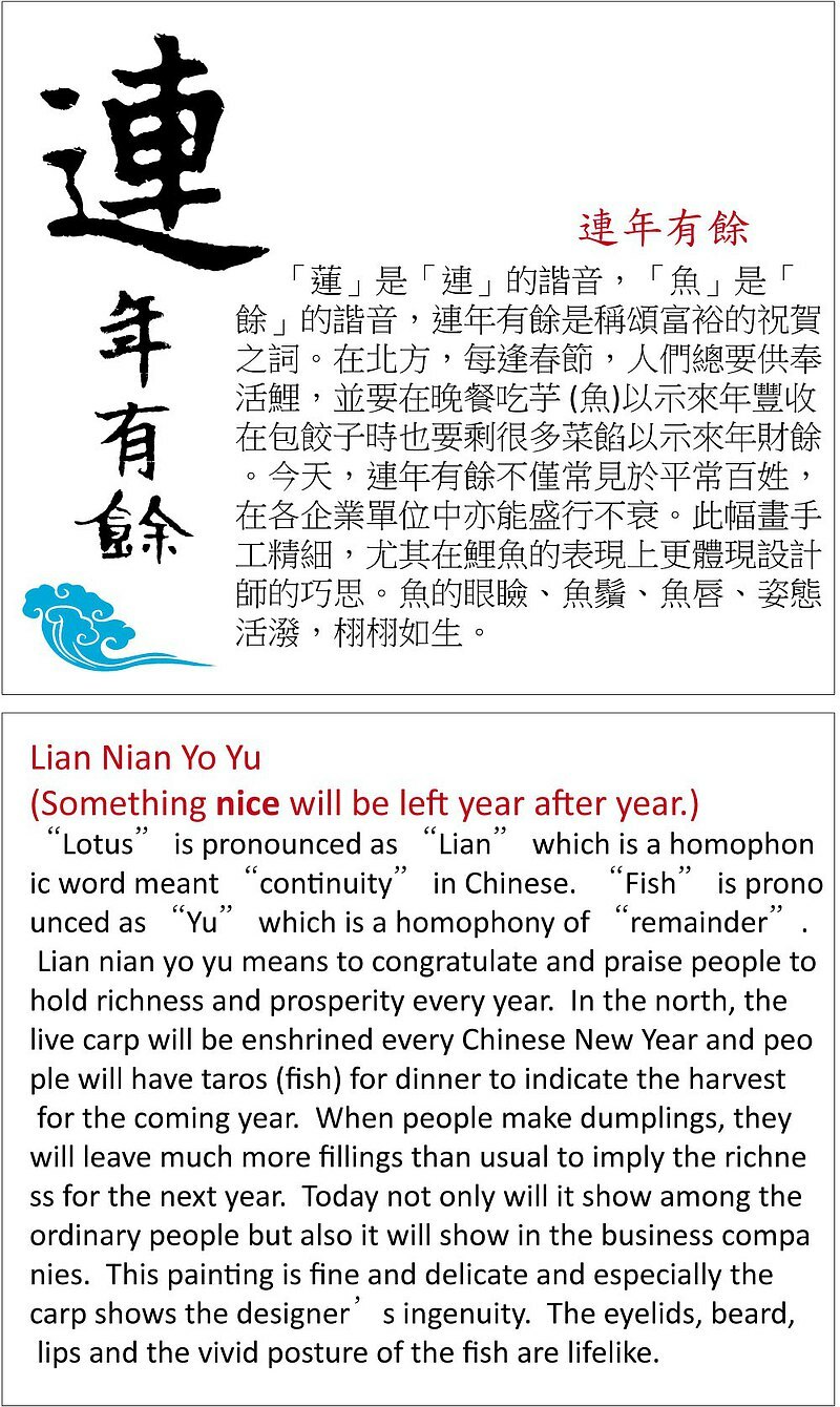 連年有餘是由蓮花和鯉魚組成的傳統的吉祥圖案,用以稱頌富裕祝賀之意。蓮是連的諧音,年是鯰的諧音,魚是餘的諧音,也稱年年有魚。