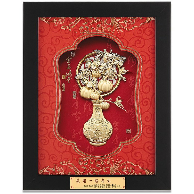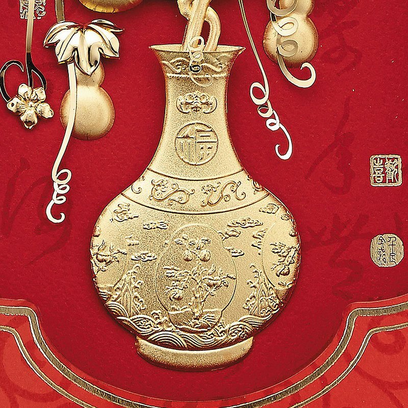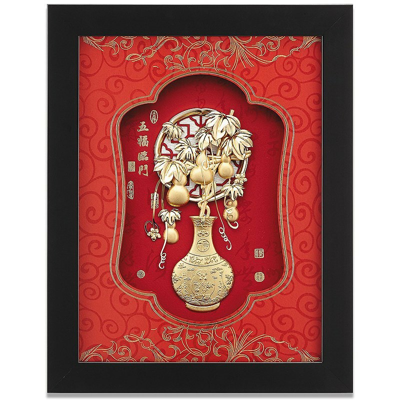 五福臨門盈萬利,八方進財樂典隆 第一福是-長壽 第二福是-富貴 第三福是-康寧 第四福是-好德 第五福是-善終 書經五福是:一曰壽、二曰富、三曰康寧、四曰修好德、五曰考的終命 本作品以五顆葫蘆瓜(台語叫ㄅㄨˊ仔)來代表五福臨門。