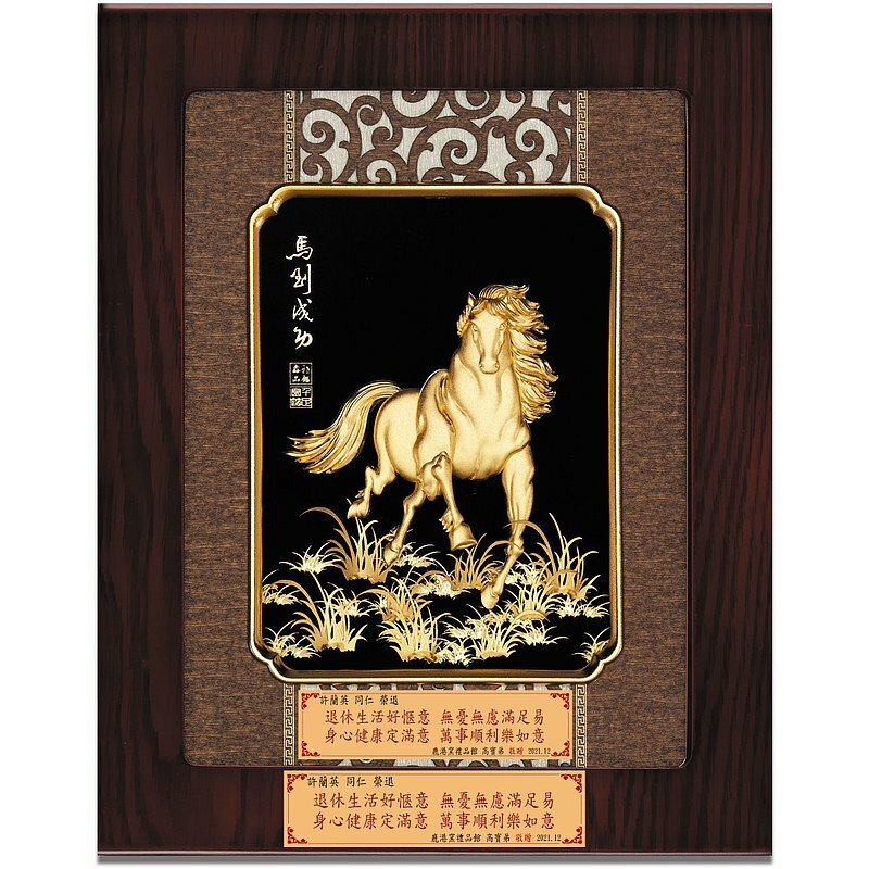 馬到成功: 形容事情一開始就取得勝利;征戰時戰馬一到便獲得勝利,比喻成功迅速而順利 。 手工貼金箔~金碧輝煌色澤和惟妙惟肖造型深受客人喜歡,不僅有很高的藝術價值和觀賞價值,更是您送禮餽贈的最佳選擇!