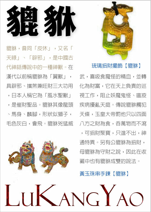 貔貅:又稱辟邪。相傳是龍生九子之一。 貔貅有招財、聚財的功效