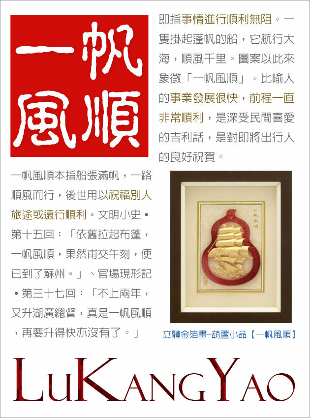 一帆風順: 一隻掛起蓬帆的船,它航行大海,順風千里--後世用以 祝福別人旅途或遠行順利 ,也比喻 人的 事業發展很快,前程一直非常順利 。 特別服務:提供客製化金箔銘版題字