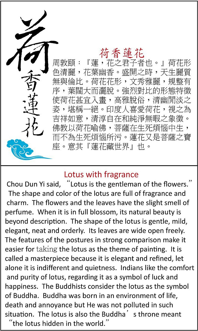 荷花花形,文秀雅麗,規整有序,葉闊大而灑脫,高雅脫俗,清幽閒淡之姿,堪稱一絕。印度人喜愛荷花,視之為吉祥如意,清淳自在和純淨無暇之象徵。 蓮又為盤根植物, 取其枝葉繁、本固枝榮之義,以祝福世人世代綿延,家業興盛。