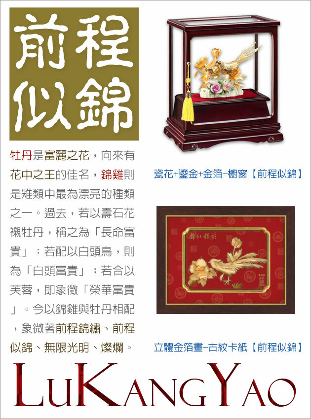 牡丹是富麗之花,向來有花中之王的佳名,錦雞則是雉類中最為漂亮的種類之一。過去, 若以壽石花襯牡丹,稱之為「長命富貴」;若配以白頭鳥,則為「白頭富貴」;若合以 芙蓉,即象徵「榮華富貴」。今以 錦雞與牡丹相配,象微著前程錦繡、前程似錦、無限 光明、燦爛 。
