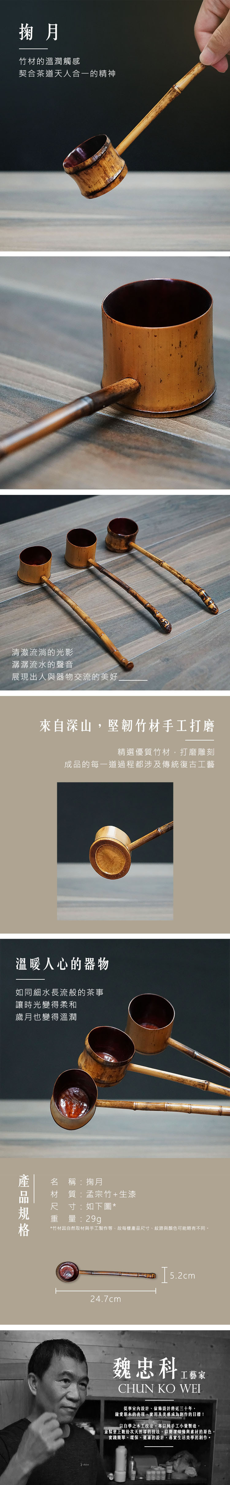 竹材的溫潤觸感, 契合茶道天人合一的精神。 清澈流淌的光影, 潺潺流水的聲音, 展現出人與器物交流的美好。 精選優質竹材,打磨雕刻, 每一道過程都涉及傳統復古工藝。 溫暖人心的器物: 如同細水長流般的茶事, 讓時光變得柔和, 歲月也變得溫潤