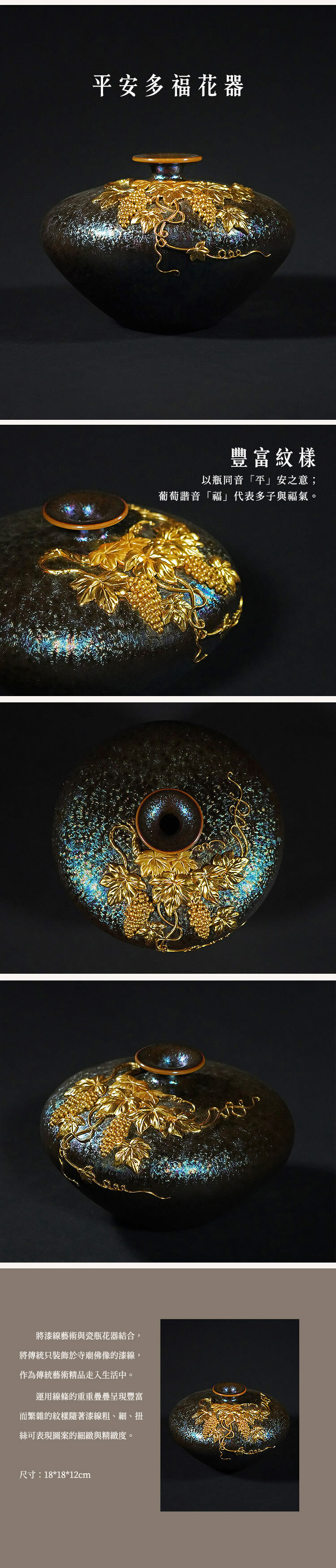 融合結晶釉與漆線金箔工藝,展現花器古典韻味,象徵平安與多福,為居家開運與藝術收藏的雅緻選擇。