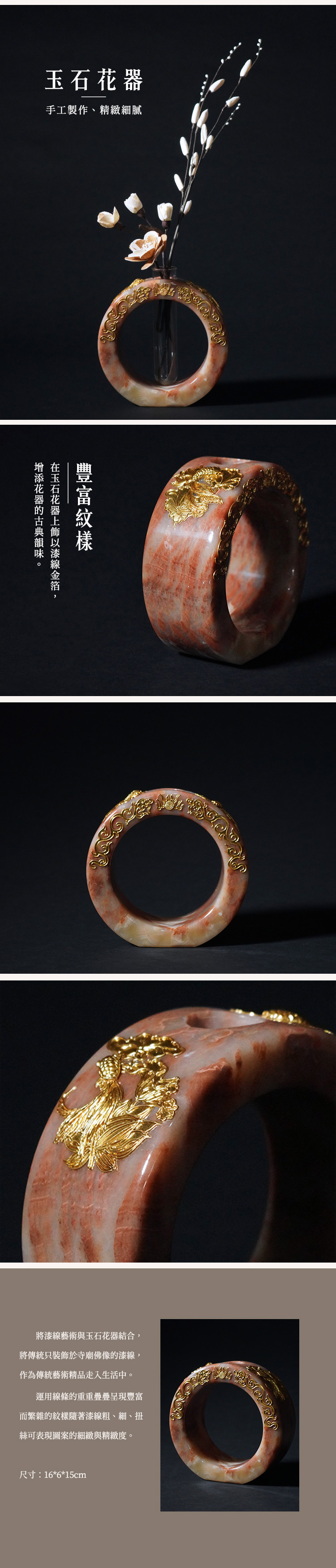 在玉石花器上飾以漆線金箔 增添花器的古典韻味