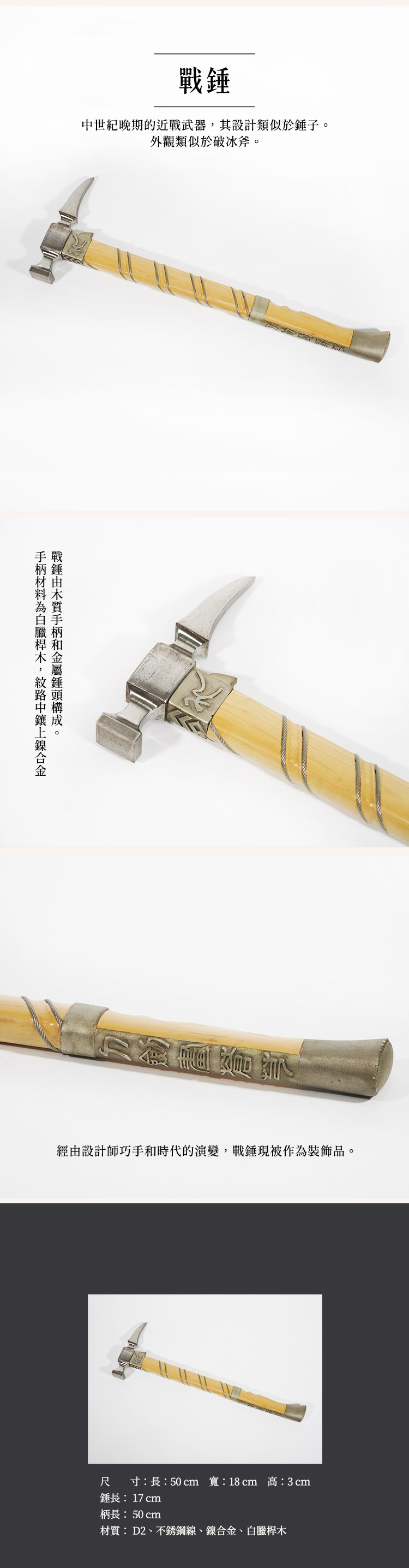 戰錘由木質手柄和金屬錘頭構成。