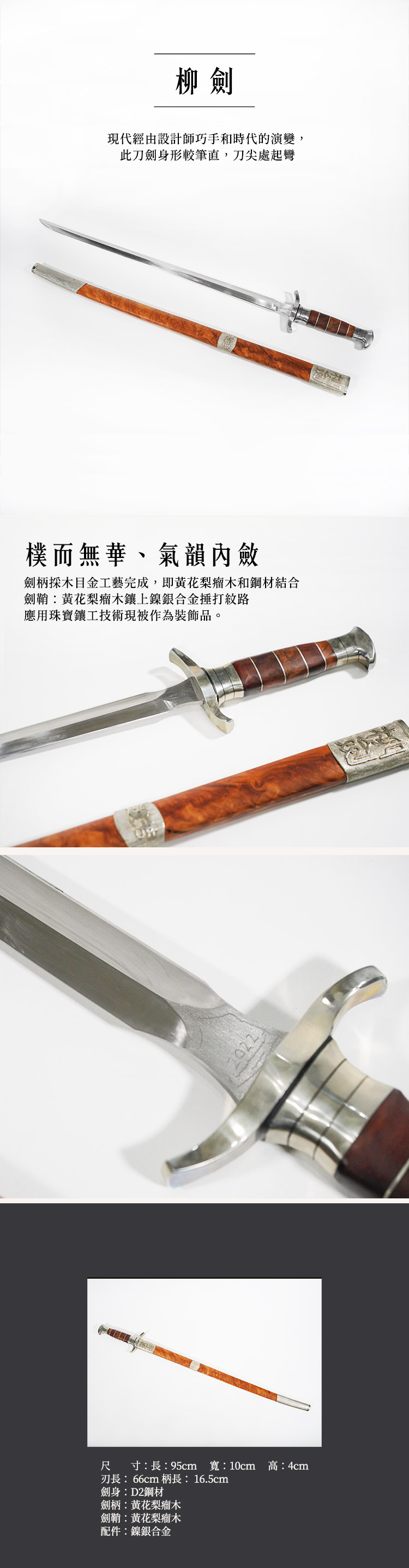 劍鞘:黃花梨瘤木鑲上鎳銀合金捶打紋路