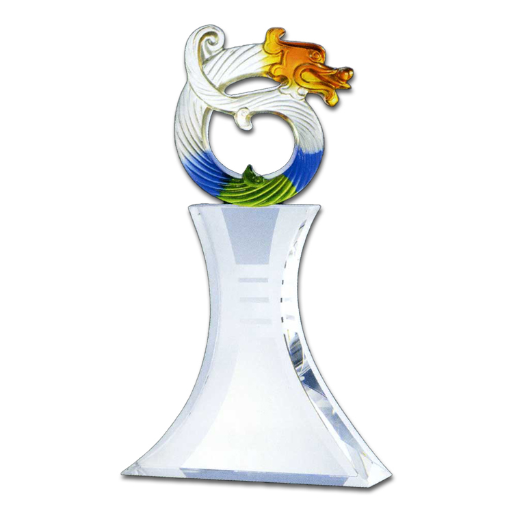 盤龍呈祥琉璃水晶獎座,採用K9高純度水晶與琉璃工藝製成,龍形設計寓意祥瑞與成功,象徵榮耀與吉祥。提供客製化刻字服務,適合頒獎典禮、商務禮贈或收藏擺飾。