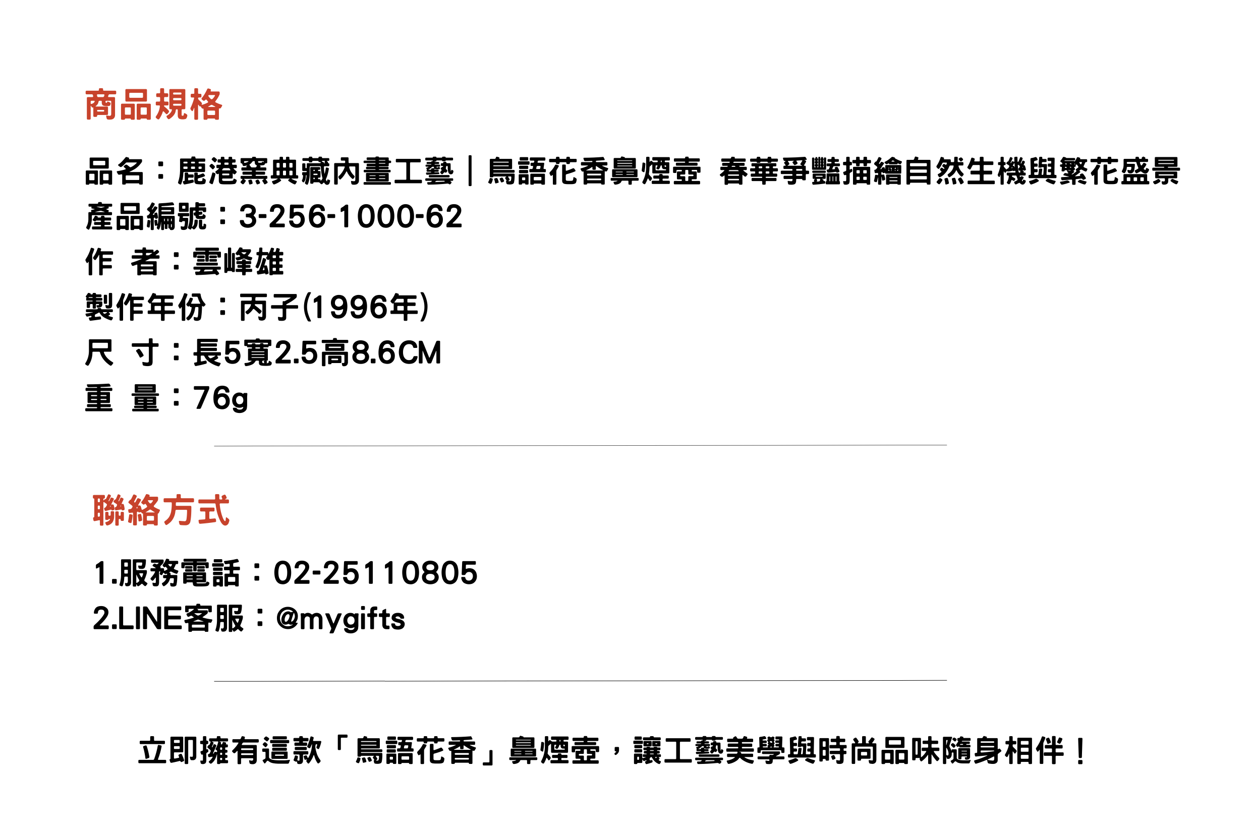 鳥語花香,自古為文人墨客吟詠的經典題材,象徵自然萬物的勃勃生機與生命的和諧律動。鹿港窯以典藏級內畫技藝,將這份春意盎然凝縮於掌中珍寶——鳥語花香鼻煙壺,細膩描繪自然景緻,寓意吉祥如意、欣欣向榮,既富文化底蘊,更具藝術價值。