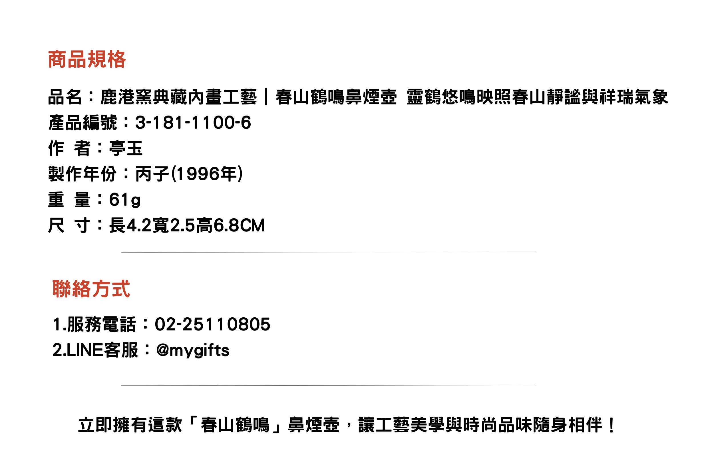 鹿港窯春山鶴鳴鼻煙壺,以細緻內畫描繪春日山景與靈鶴長鳴,呈現祥瑞氣象與自然和諧。水晶壺身薄胎精工,搭配瑪瑙蓋增添典雅氣質,是結合藝術與文化的典藏逸品。