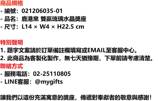 ![]() 【鹿港窯 雙贏琉璃水晶獎座】 這款獎座以「雙贏」為主題,搭配鷹眼設計,象徵洞察力、成功與合作共贏。主體由K9高純度水晶與琉璃工藝打造,質感剔透,色彩層次豐富,是頒獎或商務禮贈的最佳選擇。 產品特色