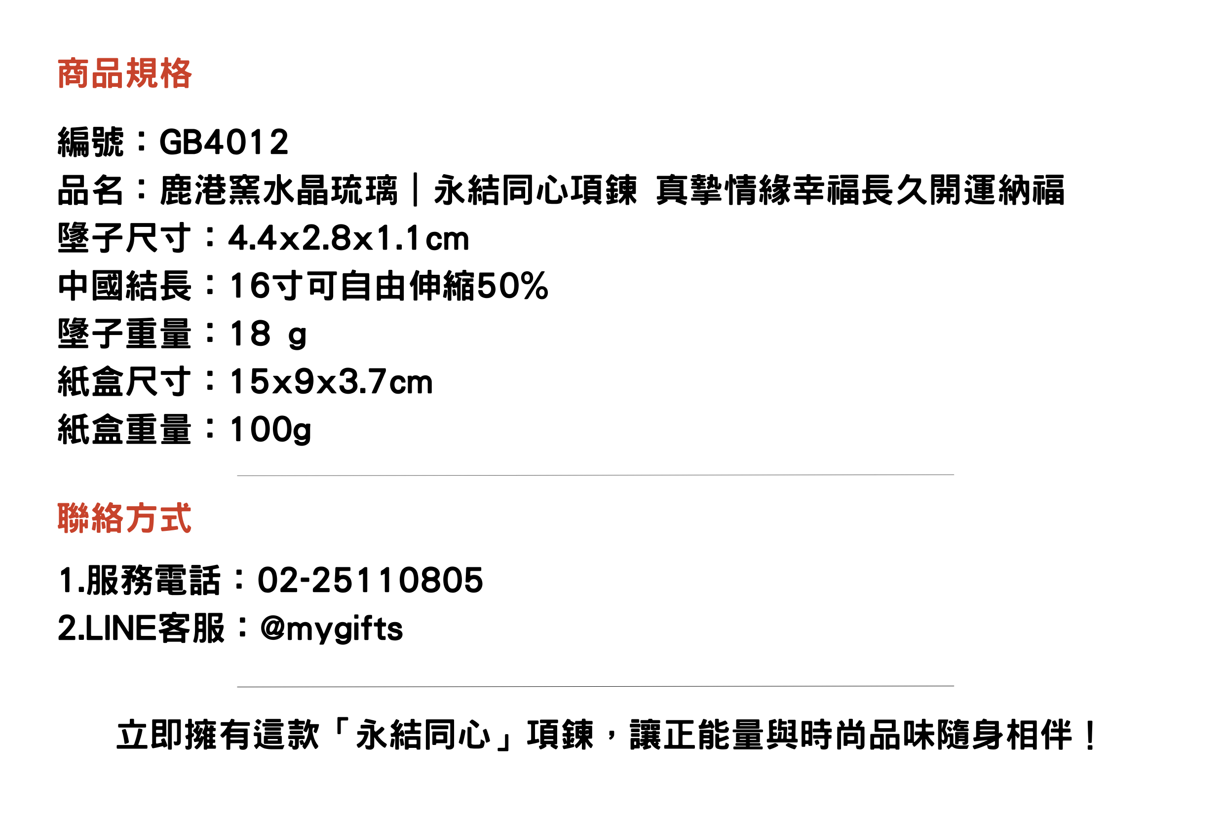 鹿港窯水晶琉璃永結同心項鍊,象徵真摯情感與幸福長久。以精湛工藝雕琢愛的印記,寓意感情美滿、和諧圓滿,是情人節、結婚紀念日的完美禮物,為摯愛帶來祝福與幸福能量。