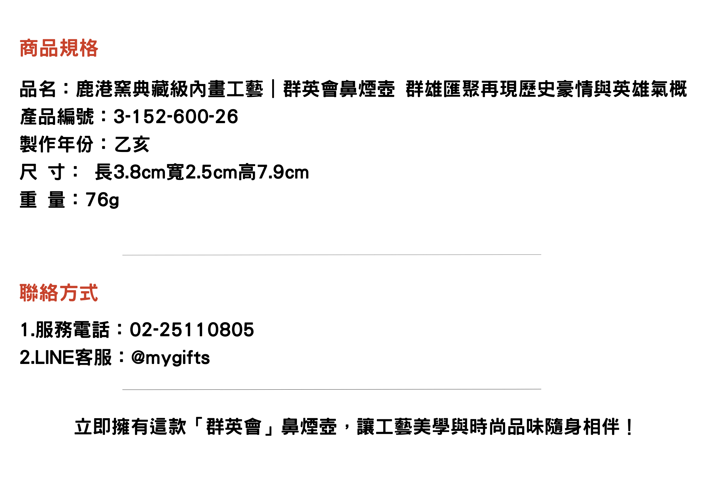 鹿港窯典藏級內畫鼻煙壺,以「群英會」為題,精工描繪英雄匯聚、智勇交鋒的歷史場景。薄胎工藝結合細膩內畫,展現磅礴氣勢與文化底蘊,極具收藏價值,亦適合作為贈禮佳品。