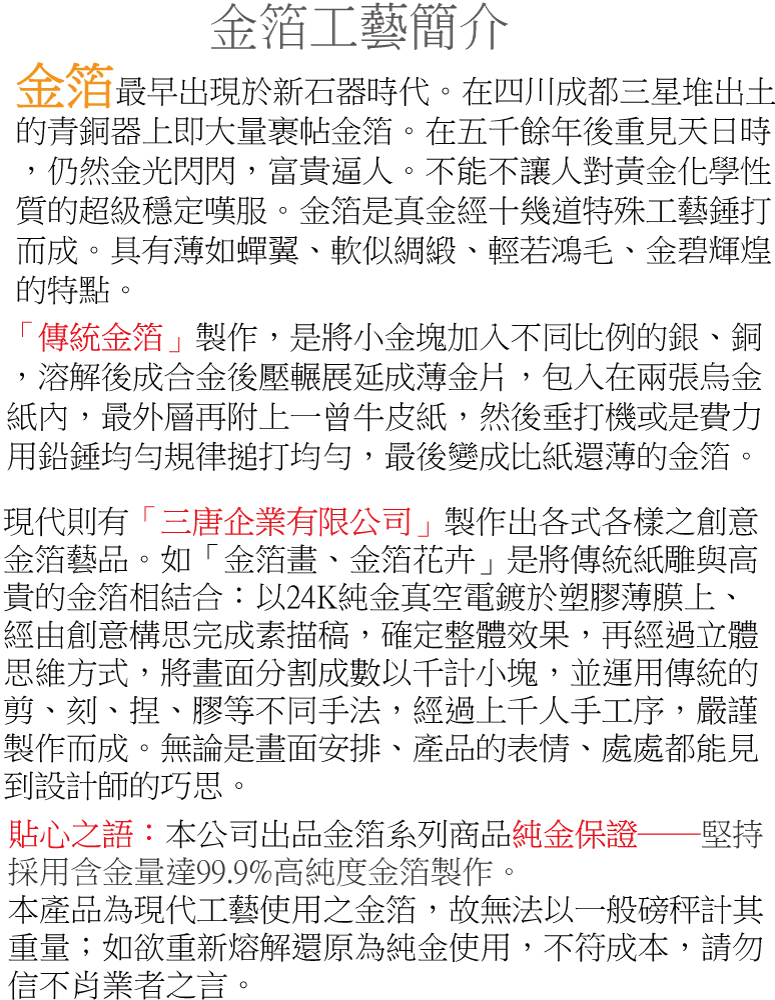 本產品為現代工藝使用之金箔,其價值在手工藝之美;如欲重新熔解還原為純金使用,不符成本,請勿信不肖業者之言。