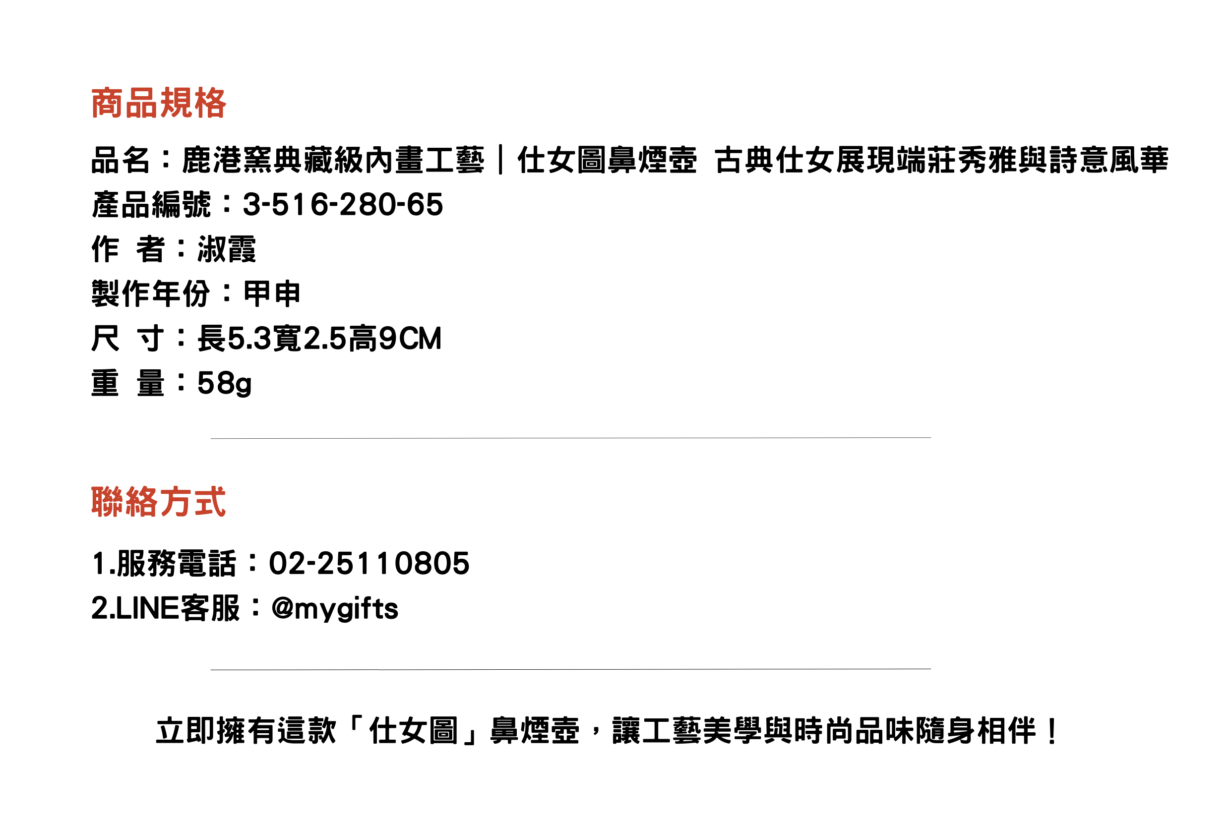 仕女圖鼻煙壺承載傳統藝術之美,展現古典仕女的端莊秀雅與詩意風華。無論是收藏自賞,還是贈送摯愛親友,皆為品味非凡的選擇。