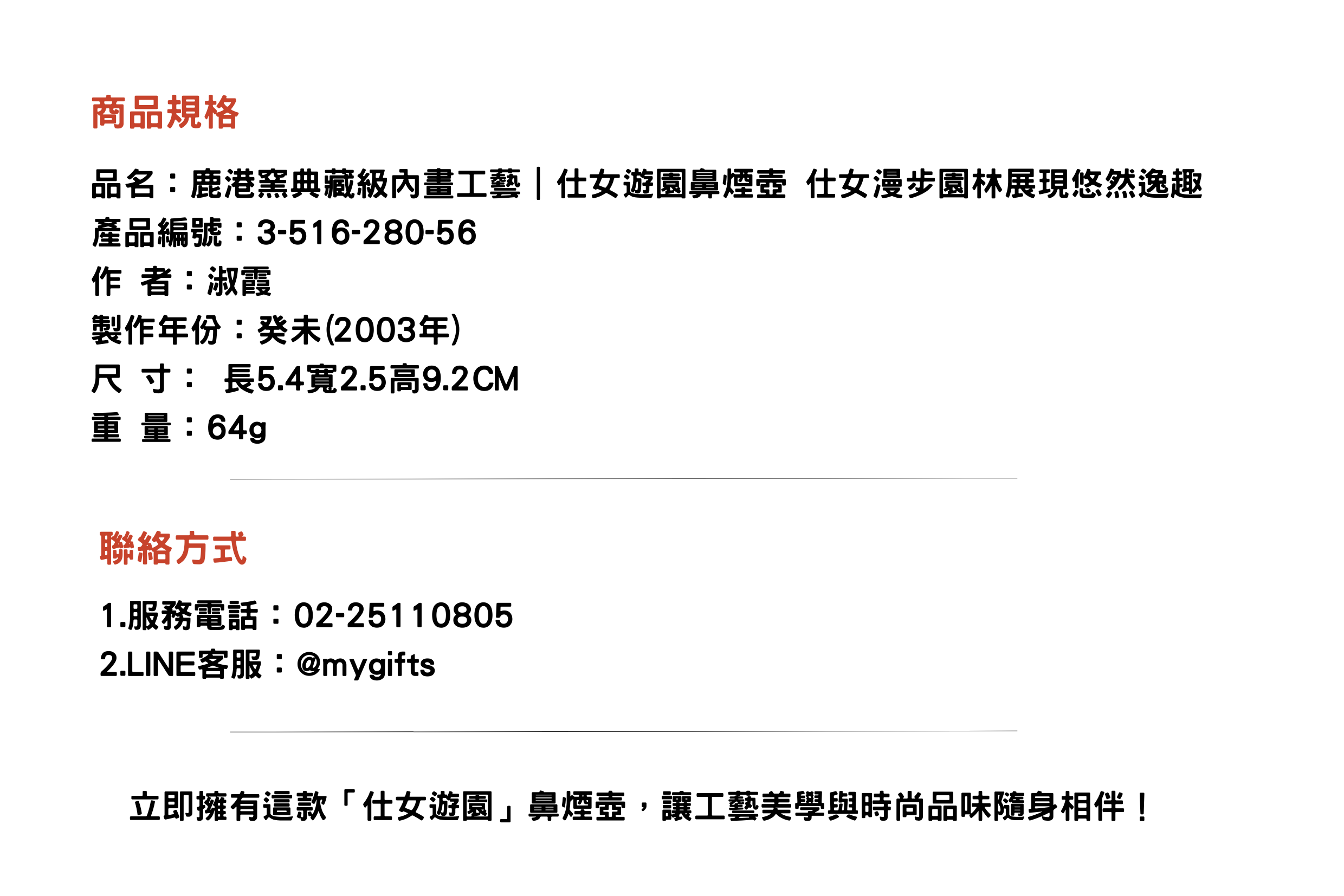 此件仕女遊園鼻煙壺將工藝美學與古風文化完美融合,是值得收藏與贈禮的東方藝術珍品。