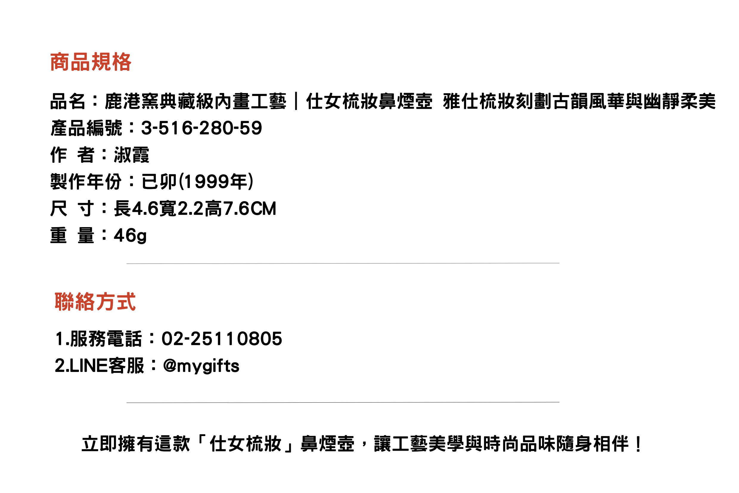 此款仕女梳妝鼻煙壺將細膩內畫技藝與古典題材完美結合,畫面靜中有韻,情景交融,是值得典藏與贈予的藝術佳作。