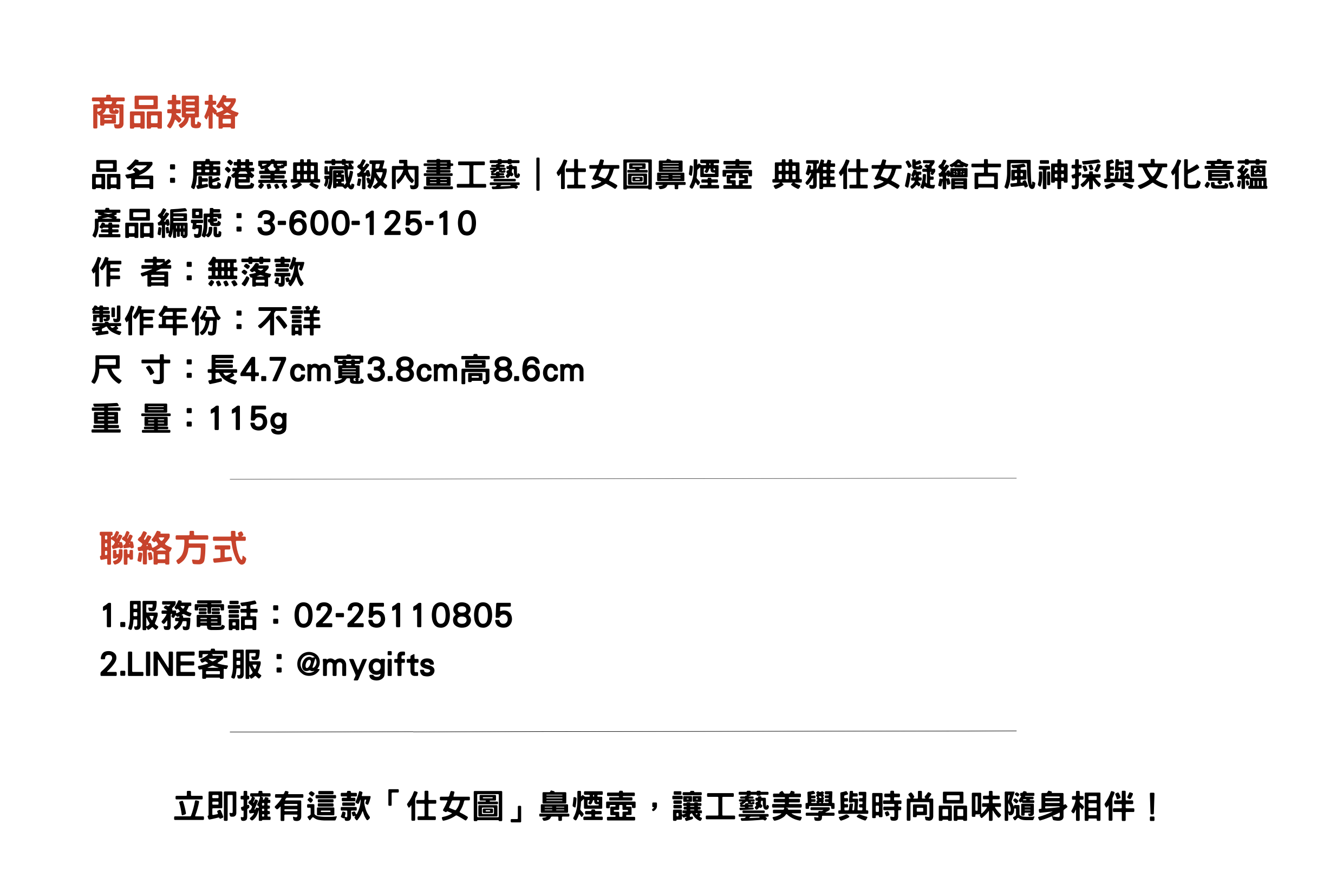 此款仕女圖鼻煙壺取材自中國古典文化中的仕女形象,以細膩筆觸描繪古代仕女的嫻靜與風採。透過傳統內畫技法,畫面展現出女性柔美的氣質與深厚的文化內涵,融合藝術與收藏價值於一體,是傳承東方美學的精品。