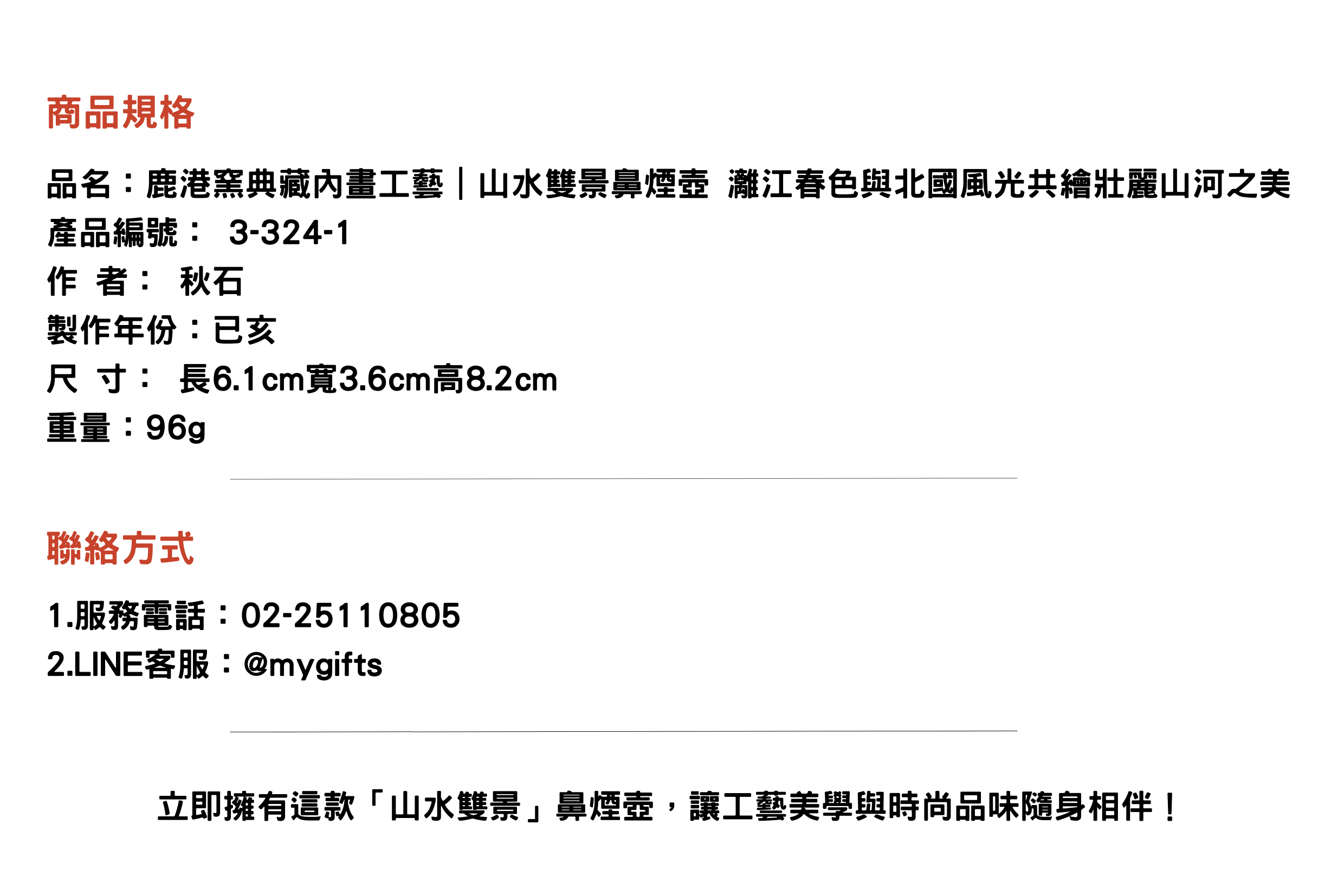 鹿港窯山水雙景鼻煙壺,匯聚灕江春色與北國風光,以精緻內畫技法描繪壯麗山河意境。薄胎工藝搭配瑪瑙蓋,展現極致工藝美感。南北風貌共存一壺,具觀賞與收藏價值,是品味雅器與藝文饋贈的絕佳之選。